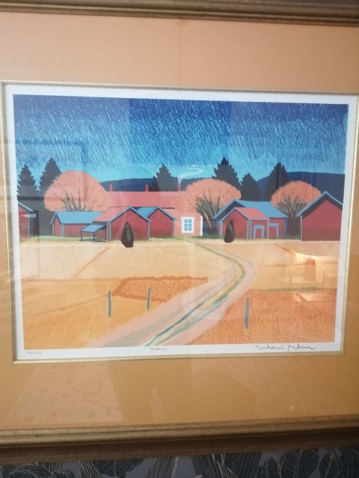 Tätä Juhani Palmun teosta kävimme tyttäreni kanssa katsomassa Naantalin näyttelyssä kahtena kesänä ja toisella se lähti mukaan. Olin ihastunut sen valoisuuteen. Siinä oli kehykset valmiina ja se painoi mahdottomasti kun kannoimme sen autoon. Tästä taitaa olla jo n. 25v aikaa.