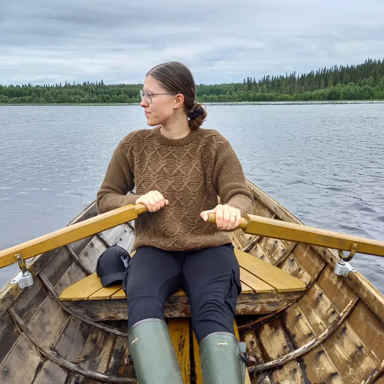Juhannuksena kävimme tarkistamassa katiskat mökkijärvellä ja isäni otti samalla kuvan vasta valmistuneesta villapaidastani. Neuloin Ronja Hakalehdon suunnitteleman Havas sweater'n suomenlampaan karstalangasta.