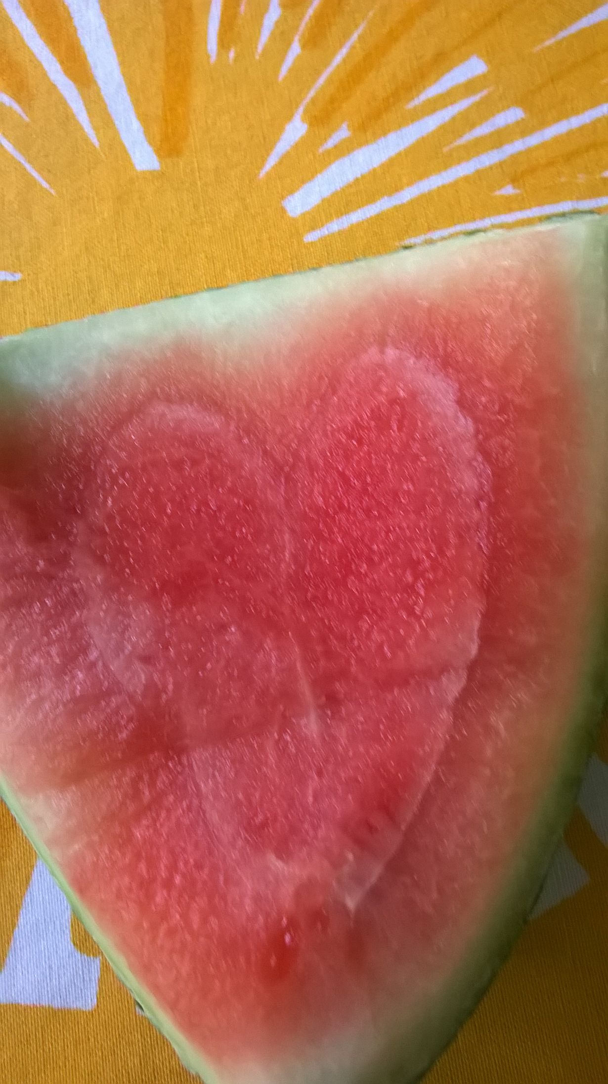 Juhannusaattona rakkaat lapseni ja lapsenlapseni olivat saapumassa meille juhlimaan keskikesää. Leikkasin kokonaista vesimelonia paloiksi ja löysin kuoren pohjalta kuvan sydämen. Ajattelin, että tämä tietää rakkaudentäyteistä aikaa meille kaikille.