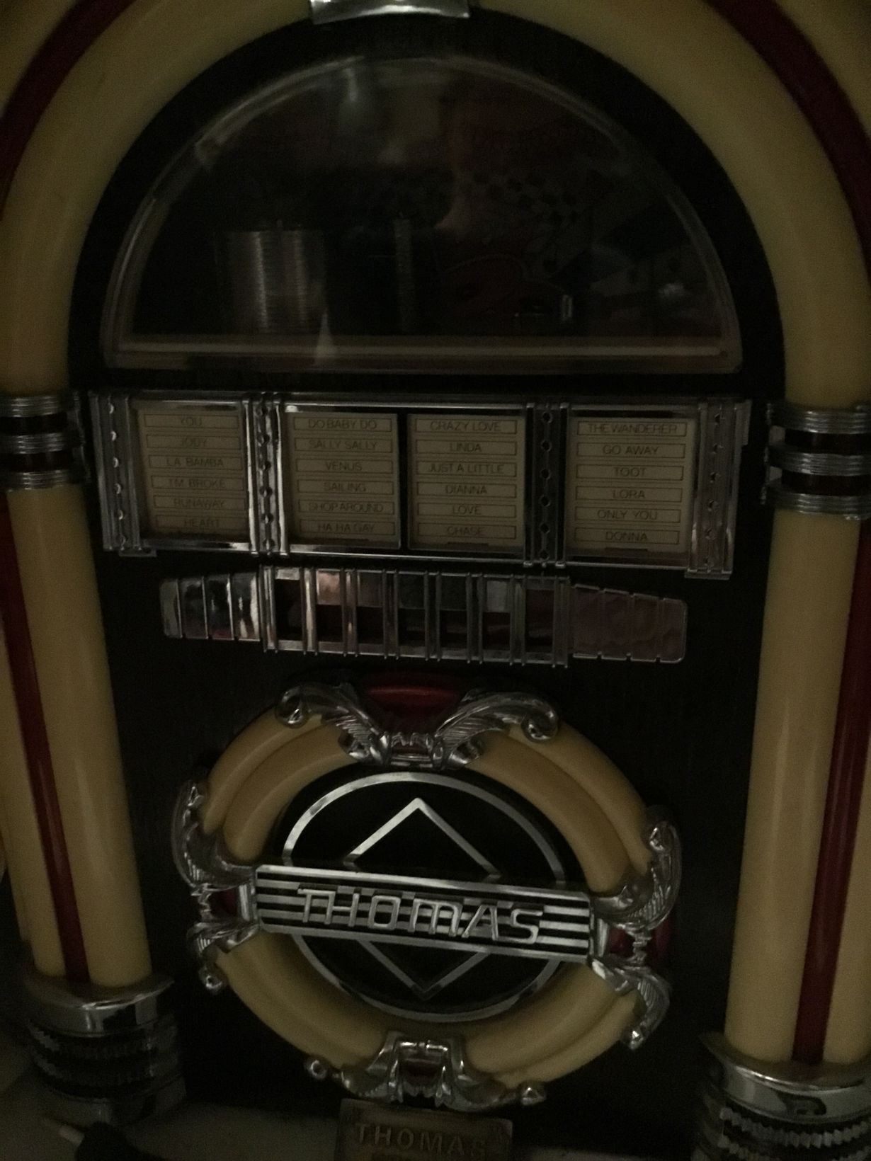 Mini jukeboxi, jossa toimii radio ja kasettisoitin. Noin 30vuotta vanha. Kuva on huono, mutta itse laite hyvä. Valotkin tulee päälle.