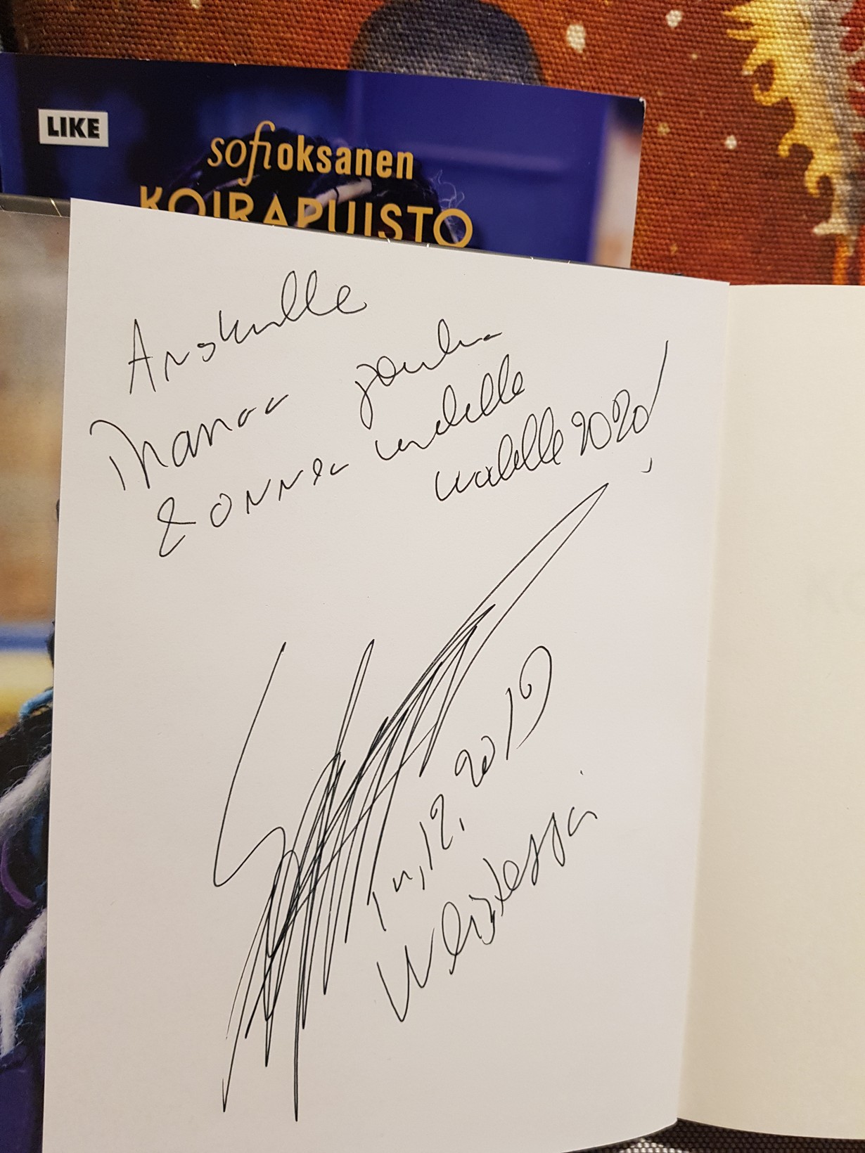 Lähetä kuva julkkiksen nimmarista – voit voittaa Arabian Pastoraali-astioita! julkkisten nimmari Sofi Oksanen Ansku 29.12.2019 klo 13:13 Siskolta joululahjaksi saatu Sofi Oksasen Koirapuisto.