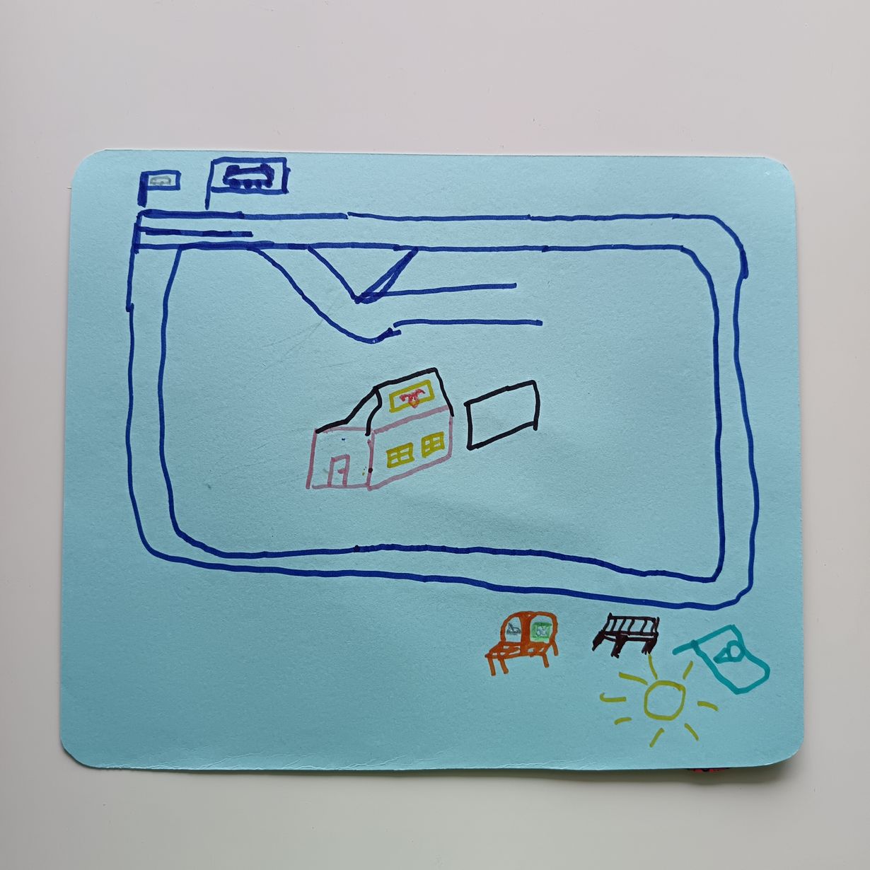 Yhdessä junamestarin kanssa piirretty kuva. Pieni juna tarvitsi raiteet ja pysäkit. Junamestari muisti ja muistutti myös ettei junassa saa syödä jäätelöä vaan se on syötävä ulkona (paikka merkattu sinisellä kyltillä).