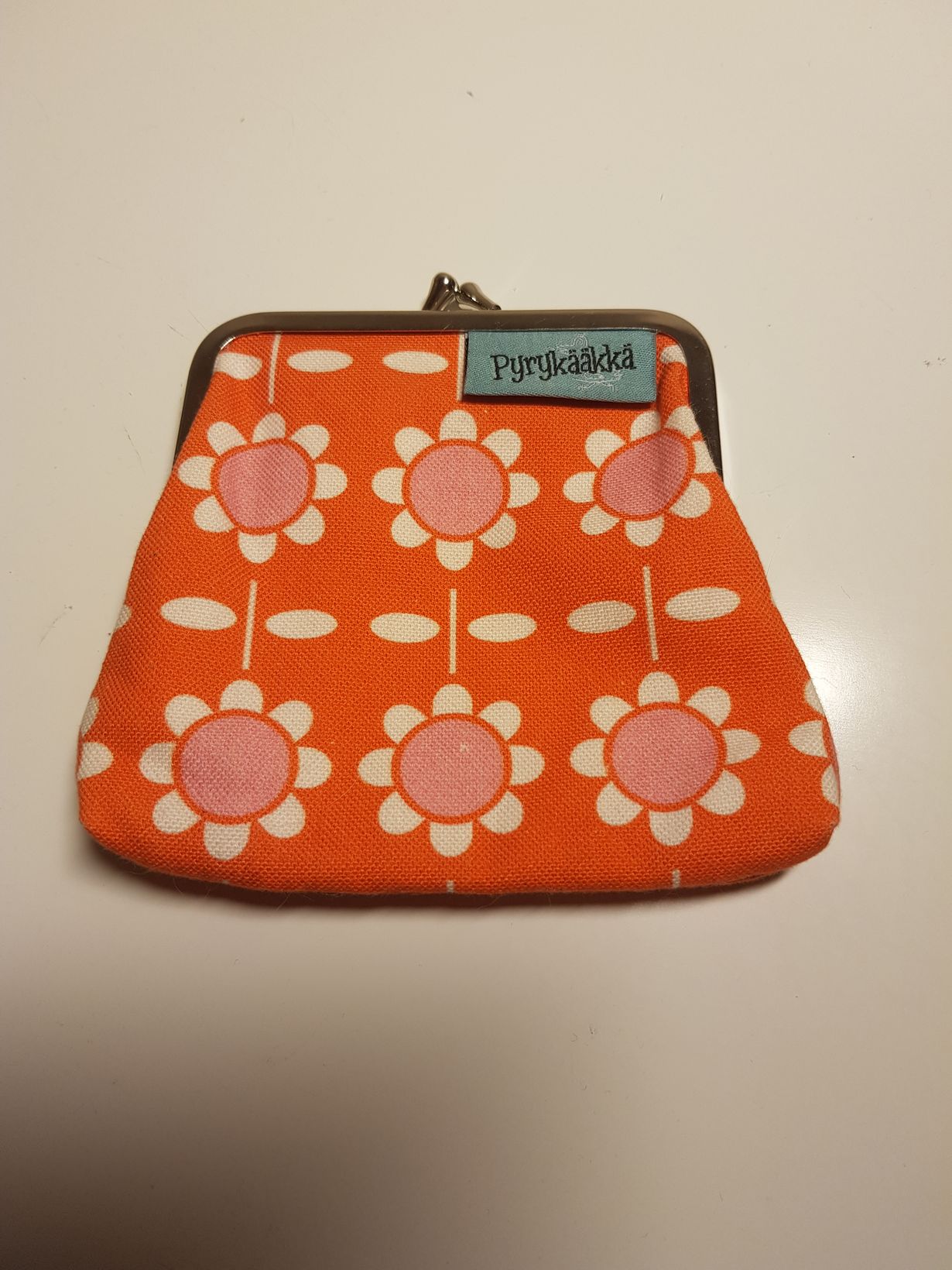 Kukkaron olen saanut ystävältäni Pyrykääkältä, joka on kuvataiteilija, käsityöläinen ja kuosisuunnittelija. Pikkulaukkuun tai taskuun sopiva päivänpaisteinen rahapussi.