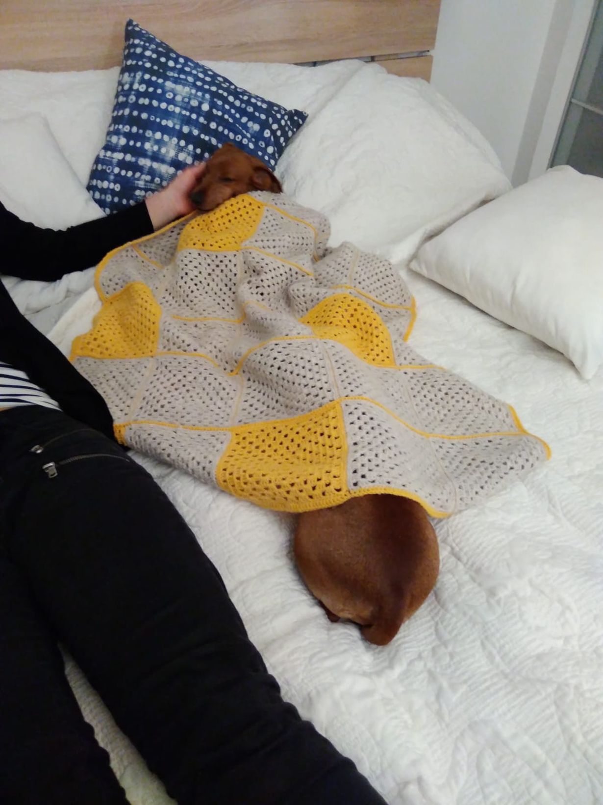Kaksi kääpiöpinseriä hauskuttavat. Milloin löytyvät tyynyliinan sisältä, milloin takinhihaan tunkeutuneena. Nehän ovat olleet ennenaikaan luolakoiria, joten mielellään änkäävät pieneen ja ahtaaseen tilaan. Yksin ei tarvitse ikinä nukkua, koska nämä lämpöpatteri nukkuvat samanpeiton alla. Joskus heräsin siihen kun kuului kova vinkaisu. Toinen kääpiöpinsereistä oli nukkunut jalkojeni välissä ja kylkeä vaihtaessani meinasin litistää sen.