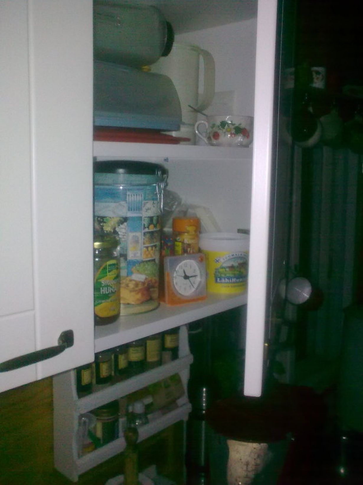 Kumppanini Sirpa on niin herkkäuninen, että herätyskello päätyi mökkimme keittiökaappiin kaappikelloksi - nyt ei tikitys kuulemma häiritse.