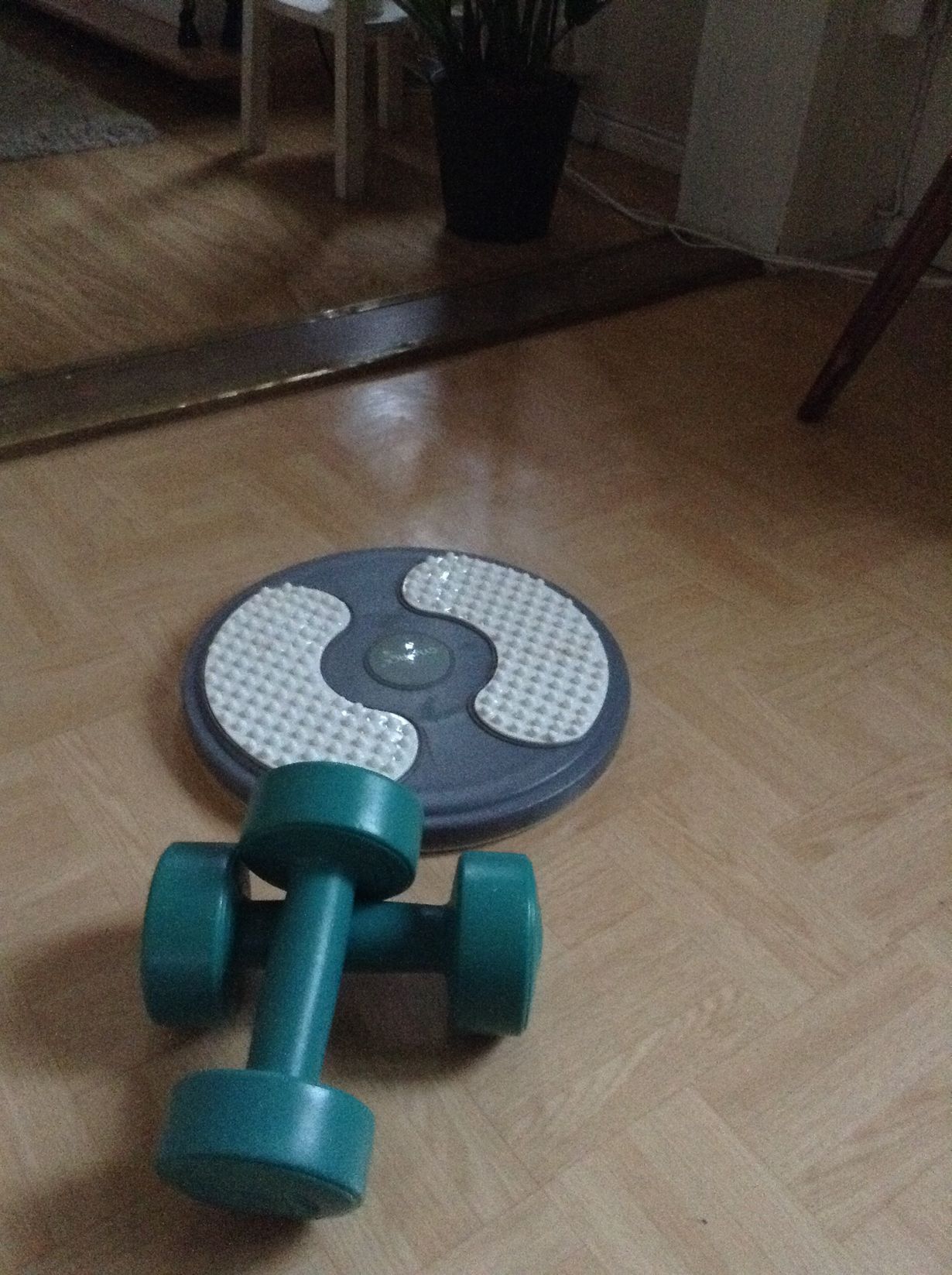 Siinä ne kököttävät olkkarin lattialla toiveenaan saavansa minuun vauhtia. Joskus innostunkin, tosin liian harvoin, ja silloin selätin rullaa ja minä sen päällä painot heiluen :)