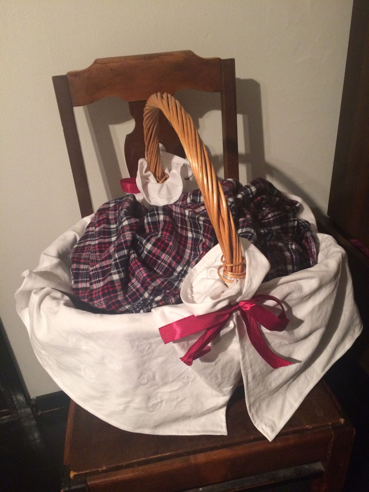 Hei, tässä kahden hengen pyykkikori. Meidän kauppakori oli aika rispaantunut ja kaipasi uutta käyttötarkoitusta. Samoin pöytäliina jota lasten hamsterit olivat nakertaneet aikaa sitten, enkä ollut raaskinut heittää arvokasta kangasta pois. Näistä yhdessä tuli meidän pieneen makuuhuoneeseen sopiva pyykkikori joka kulkee näppärästi kodinhoitohuoneeseen.
