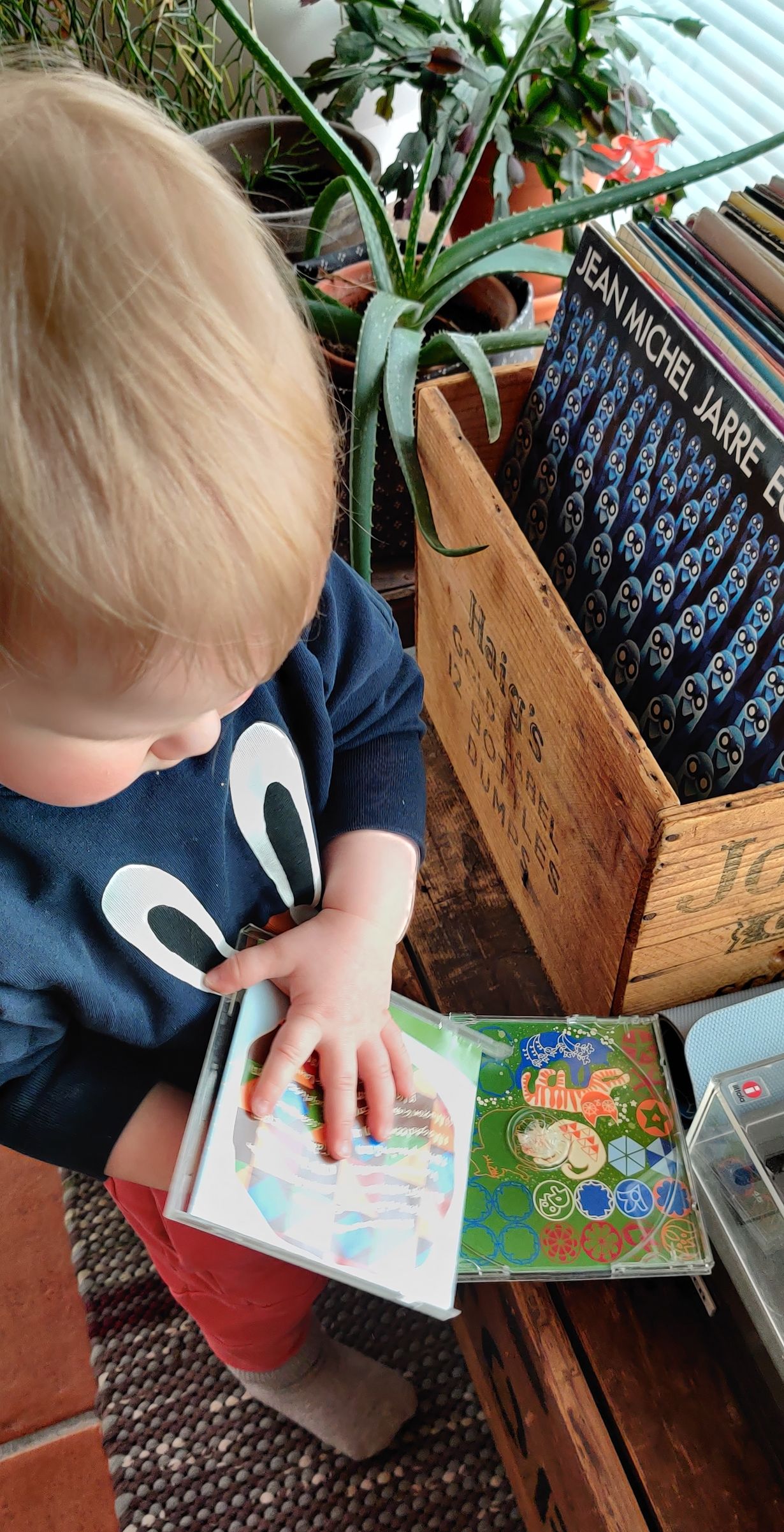 Kahden sukupolven arjen suosikkilevyt: vanhempien lemppari Jean Michel Jarren Équinoxe -vinyyli ja lasten kovassa kuuntelussa oleva PMMP: Puuhevonen cd.