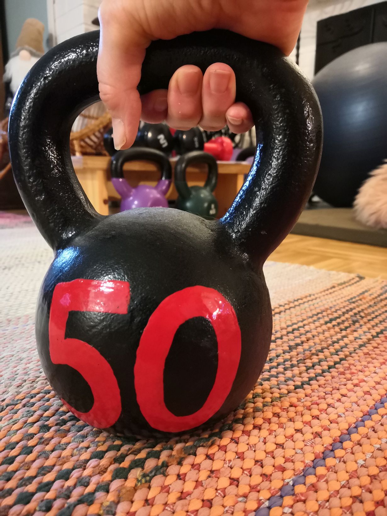 Sain lapsiltani 50-vuotislahjaksi 10 kg:n kahvakuulan. Aluksi tosin luulin, että maalattu 50 tarkoittaa 5kg:n kuulaa ja mietin, ettei omat käsivoimat kovin heppoisia ole, kun kuula tuntui yhdellä kädellä nostaessa raskaalta! (harjoitus tuli siis tarpeeseen😁) Nyt kahvakuulailu on ollut jo 10 vuotta lempilajini - lähdin aluksi liikuntakeskuksen ryhmään ja nyt teen harjoituksia kotona ja kuuliakin on kertynyt jo pieni kokoelma 8-16kg. Ehkäpä joskus alan ohjata senioriryhmää.. Selkeää ja tehokasta liikuntaa, kiitos lapsille innoituksesta!