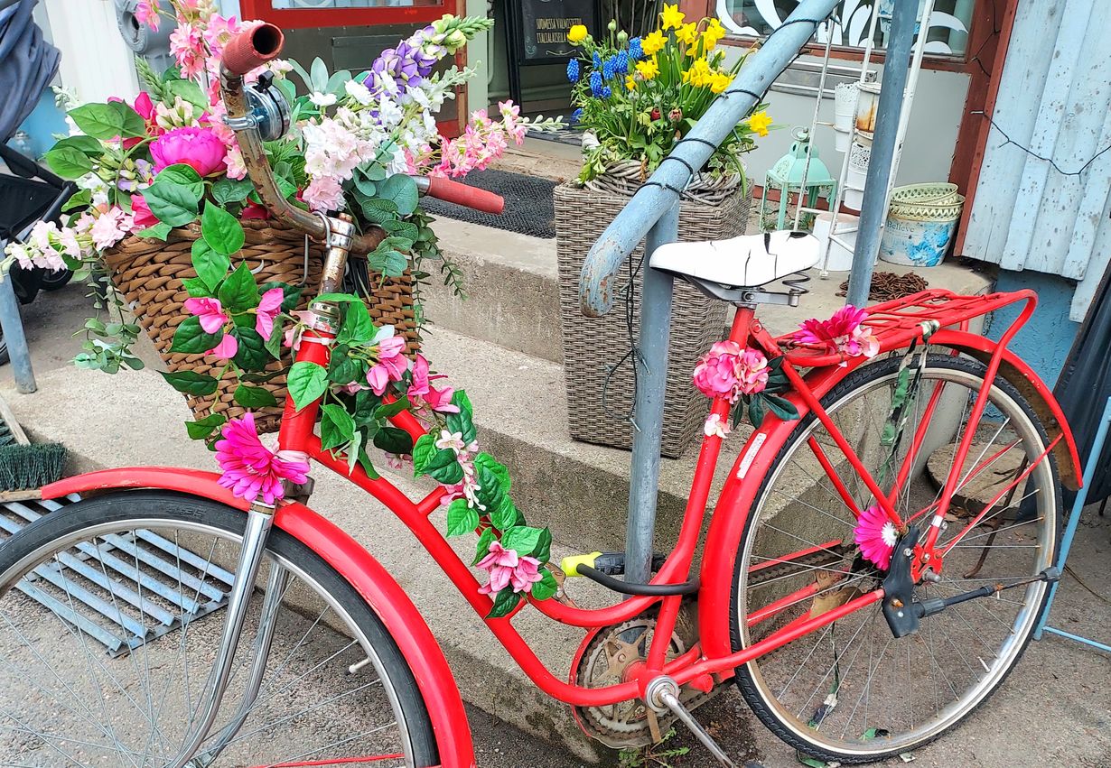 Lempikahvilani ovella on somisteena tämä ihana vanha pyörä. Koronasulkujen aikaan kaipasin ihania leivoksia ja croissantteja, ja ohikulkiessa huomasin että pyöräkin tuntui vaipuneen harmaaseen synkkyyteen. Kun kahvilat jälleen avautuivat oli päivä entistä kirkkaampi, leivokset entistä makoisampia ja pyörä entistäkin punaisempi ❤