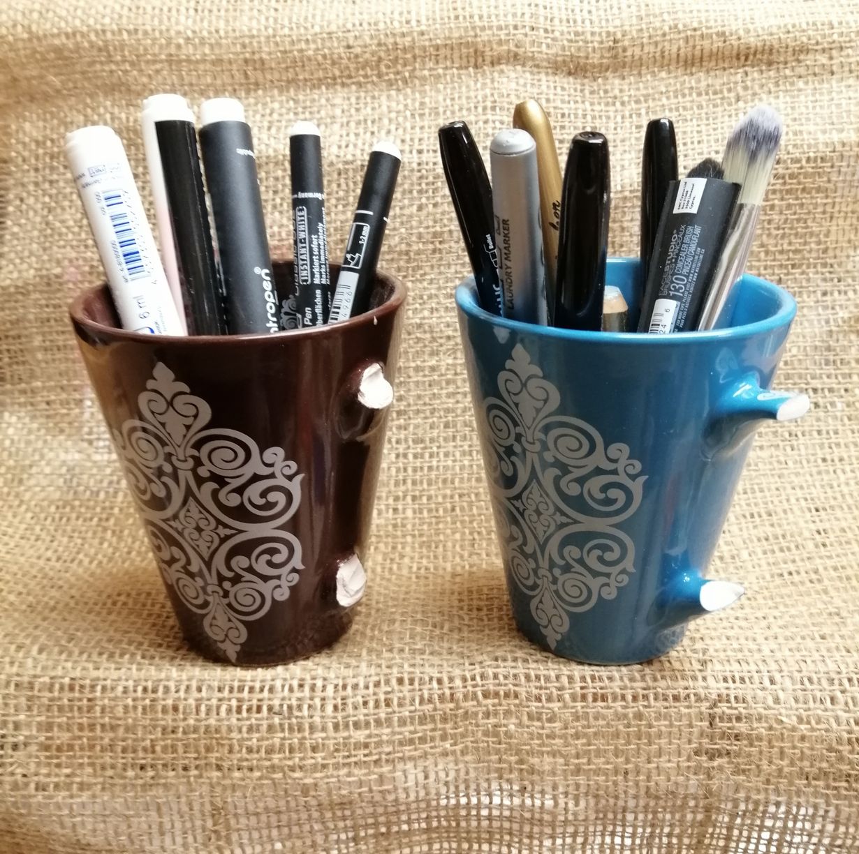 Kahvikuppien korvat katkesivat, mutta saivat uuden elämän työpajalla kynäpurkkeina. Kaunis pari, kun kääntää korvat seinää päin...