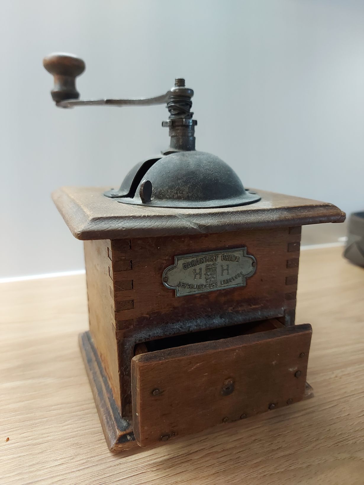 Vietin lapsuuteni kesät äitini lapsuuden kodissa Haminassa. Muutaman vuoden ikäisenä iskin silmäni hyllyssä lojuvaan pölyiseen kahvimyllyyn ja kerta toisensa jälkeen jaksoin jauhaa sillä mielikuvituskahvipapuja. Haaveilin tuolloin useasti omistavani tuon kamalan kapistuksen ja kas, nyt yli 30 vuoden jälkeen, kannoin sen vihdoinkin omaan kotiini. Vanha se on ja romukin, mutta paikkansa se on löytänyt.