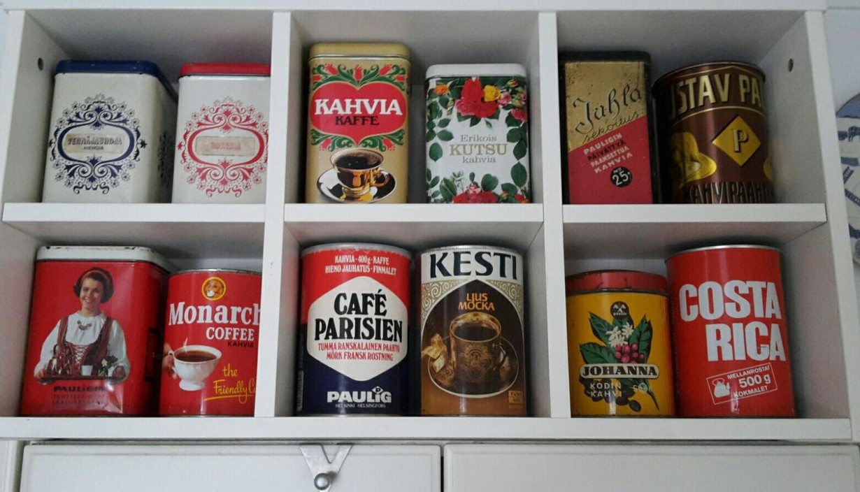 Olen keräillyt vanhoja kahvipurkkeja hyllyyni mökille. Ensin nämä kahvipurkit olivat takan päällä, mutta sitten sain idean ja ostin niille oman hyllyn. Mielestäni hyllyni huokuu nostalgiaa. Harmi kun se on nyt täynnä.