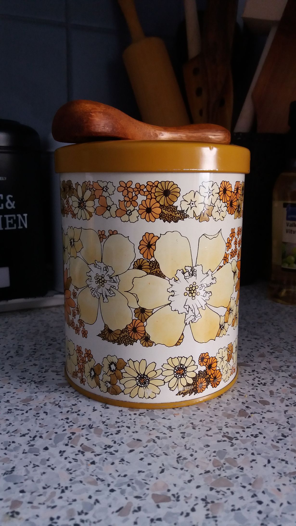 Kahvipurkki oli käytössä äidilläni hänen muuttaessa ensimmäiseen asuntoonsa, perin purkin yhdeksän vuotta sitten oman muuttoni yhteydessä. Aurinkoinen kuvio piristää aamun jo ennenkuin kahvia on edes keitetty.