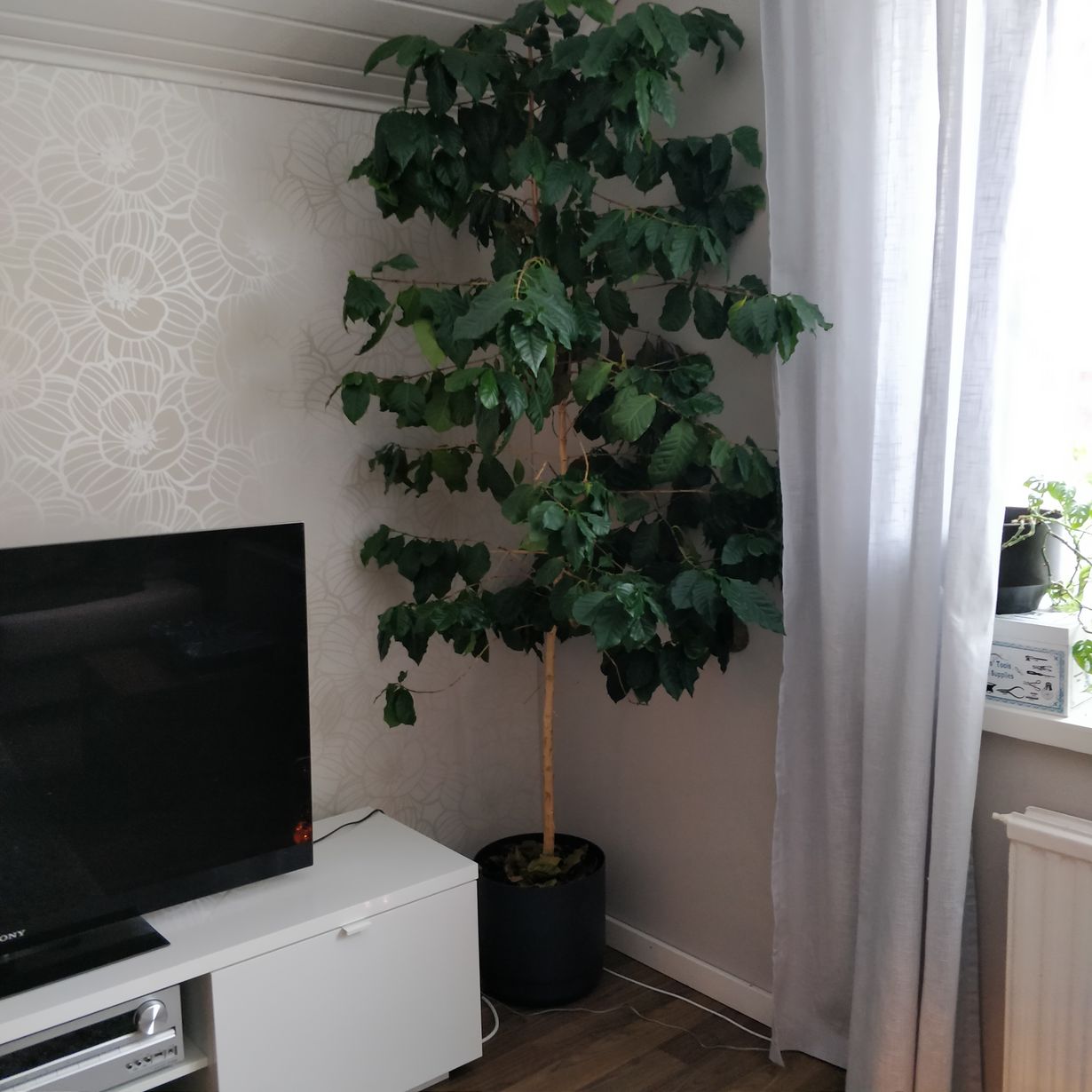 Sain tämän kahvipuun taimen ensimmäisen kummilapseni ristiäisissä. Se on kulkenut mukana muutoissa ja oli välillä hoidossa ulkomailla asumisen vuoksi. Puu on tehnyt papujakin. Ensi kesänä tämä ensimmäinen kummilapseni pääsee ripille.
