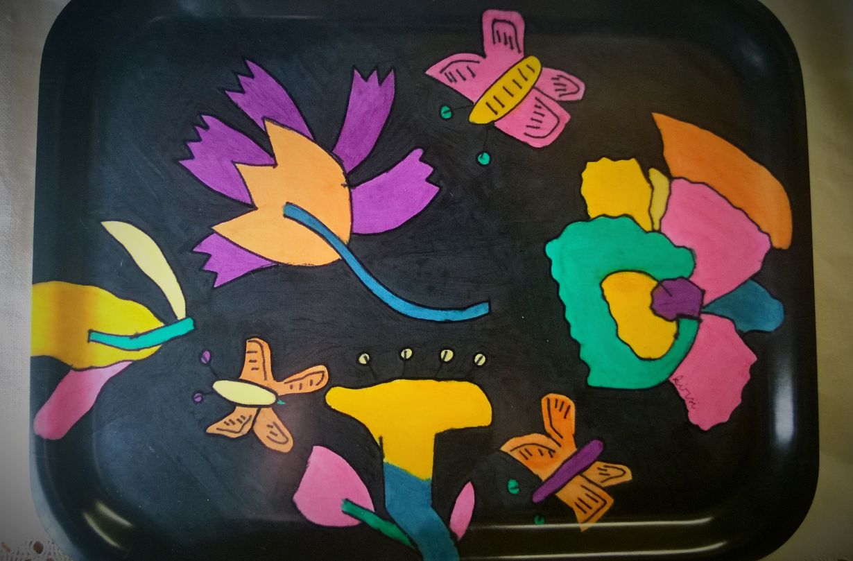Ostin tarjottimen Kirsikodin, paikallisen kehitysvammaisten taideyhteisön näyttelystä muutama vuosi sitten, kevään kunniaksi ja ihan vaan omaksi ilokseni.