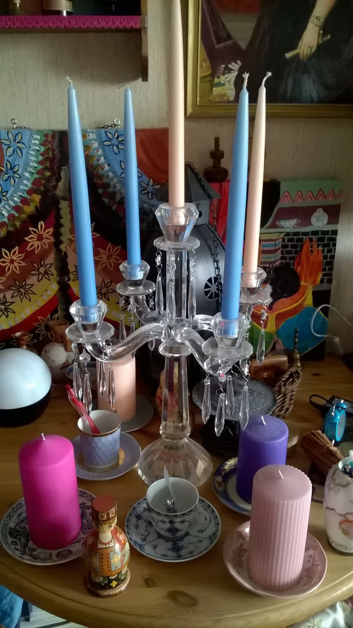 Minulla on yöpöydälläni kristallikynttelikkö, kaksi metallista kynttilälyhtyä sekä punertavan värimaailman pöytäkynttilöitä. Sekä pallonmuotoinen kelloradio, ja pari kaunista posliinikuppiparia mm. kynien kätevään säilytykseen ja muuten vain kauniin ihailuun.