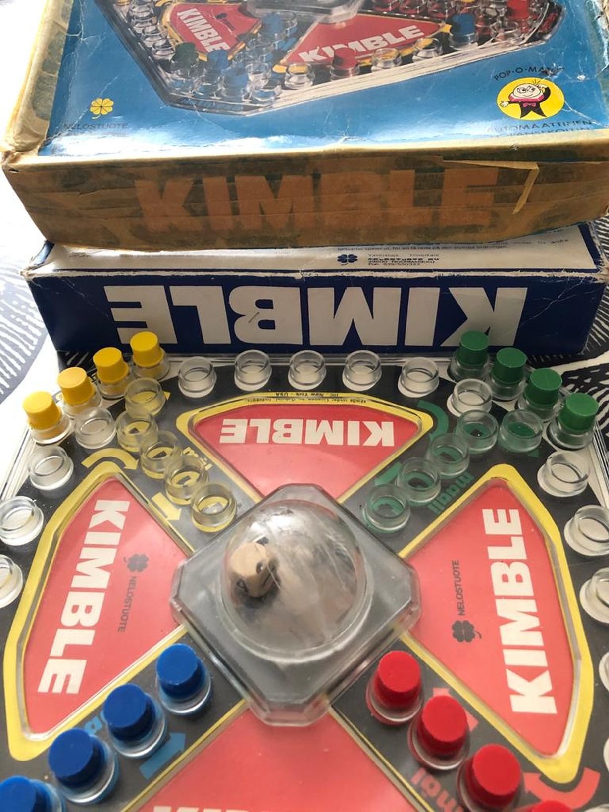 Sain tämän noppavaurioisen Kimblen vuonna 1978. Kuten rujosta kuupasta huomaa, on peliä pelattu todella paljon ja pelataan edelleenkin. Pelin pakkausta on pitänyt hieman teipillä korjailla, jotta pysyy kasassa.