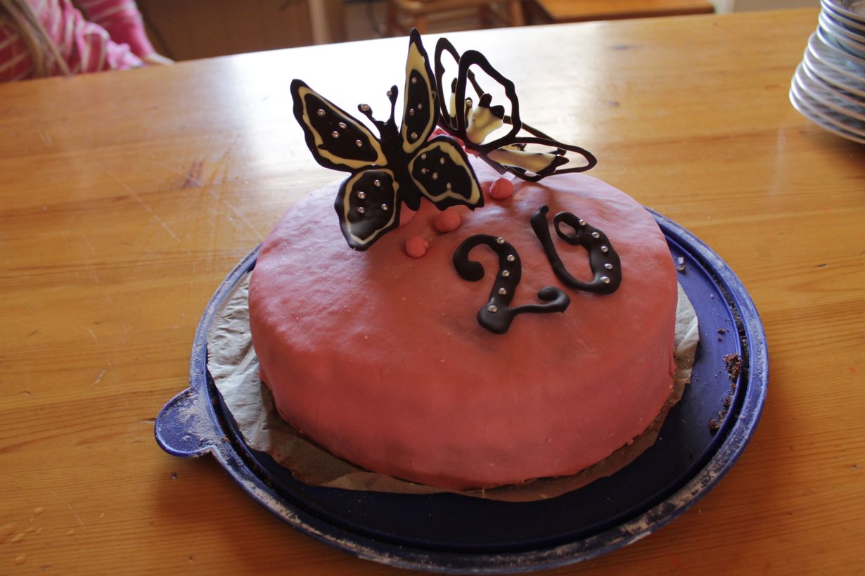 Tein tyttärelleni synttärikakun hänen toiveidensa mukaan: vaaleanpunaista ja perhosia. Itse sulatetusta suklaasta tehdyt perhoset koristavat meillä melkein jokaista kakkua!