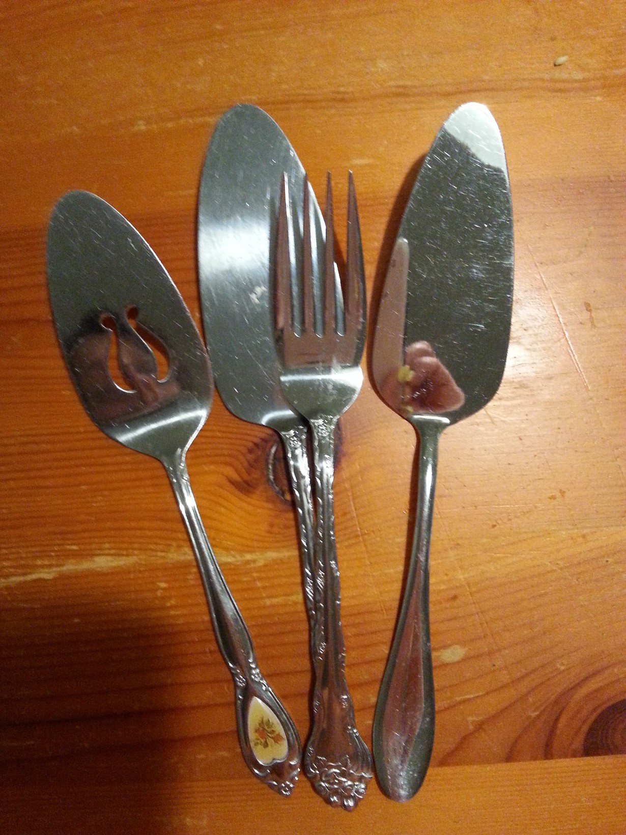 Siinäpä ne. Kaikki kolme. Kaikilla oma tarina takana. Vasemman puoleisen olen perinyt edesmenneeltä Isoäidiltäni. Mukana lisäksi 6kpl kahvilusikoita. Keskellä olevan kakkulapio parin sain muutamia vuosia sitten muuttotyhjennystä tehneeltä ystävältäni. Oikean puoleinen lapio taas on hätä ostos matkalla töihin. Kakku matkassa mutta lapio puuttui.