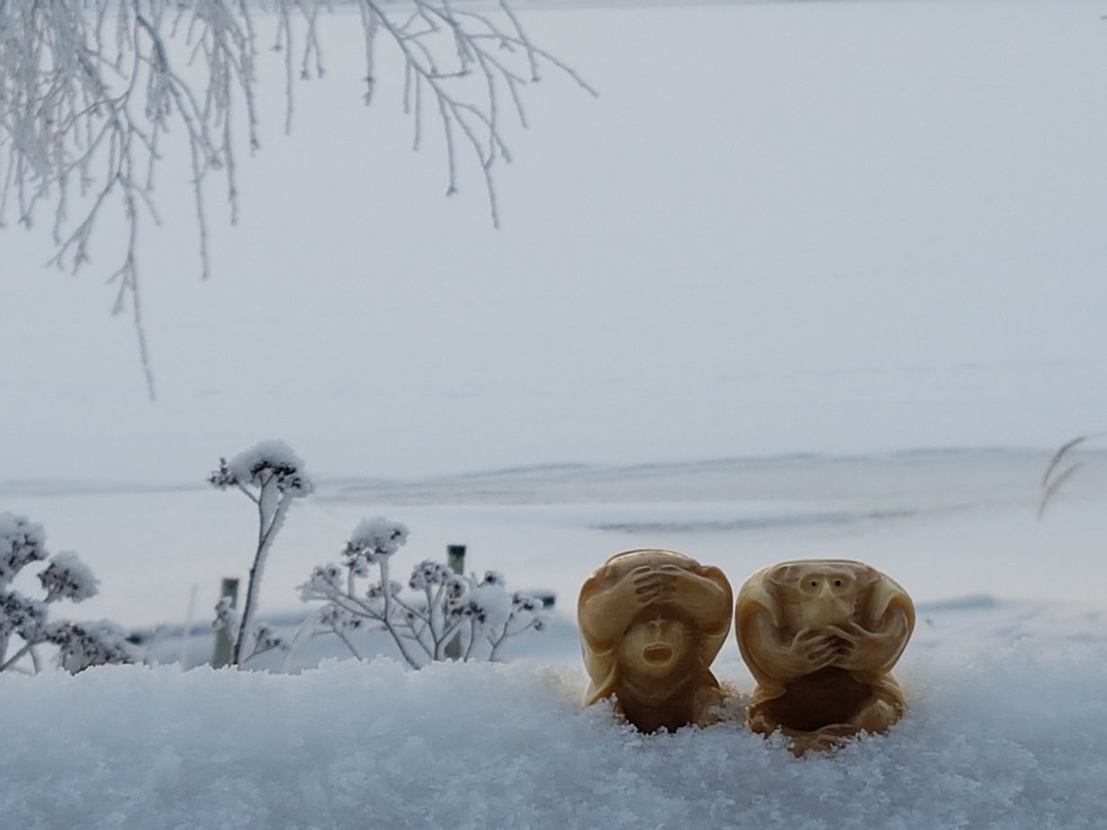 Vancouverin kiinalaisen kaupunginosan puistossa törmäsimme ensin hääpariin ja sitten matkamuistomyymälän ainakin 80 v mies kyseli horoskooppiamme (kiinalaisia emme tietenkään tienneet) Kun hän kuuli, syntymävuotemme ja ikäeromme 12 v hän suorastaan riehaantui: "Kaksi apinaa, ei voi olla totta. Kaksi apinaa:teillä on varmaan hurjan hauskaa keskenään." Ja niin meillä onkin. Nämä kiviset apinat muistuttavat meitä milloin missäkin siitä, että meillä on kaksi korvaa ja kaksi silmää, jotta voimme nauttia hetkestä.