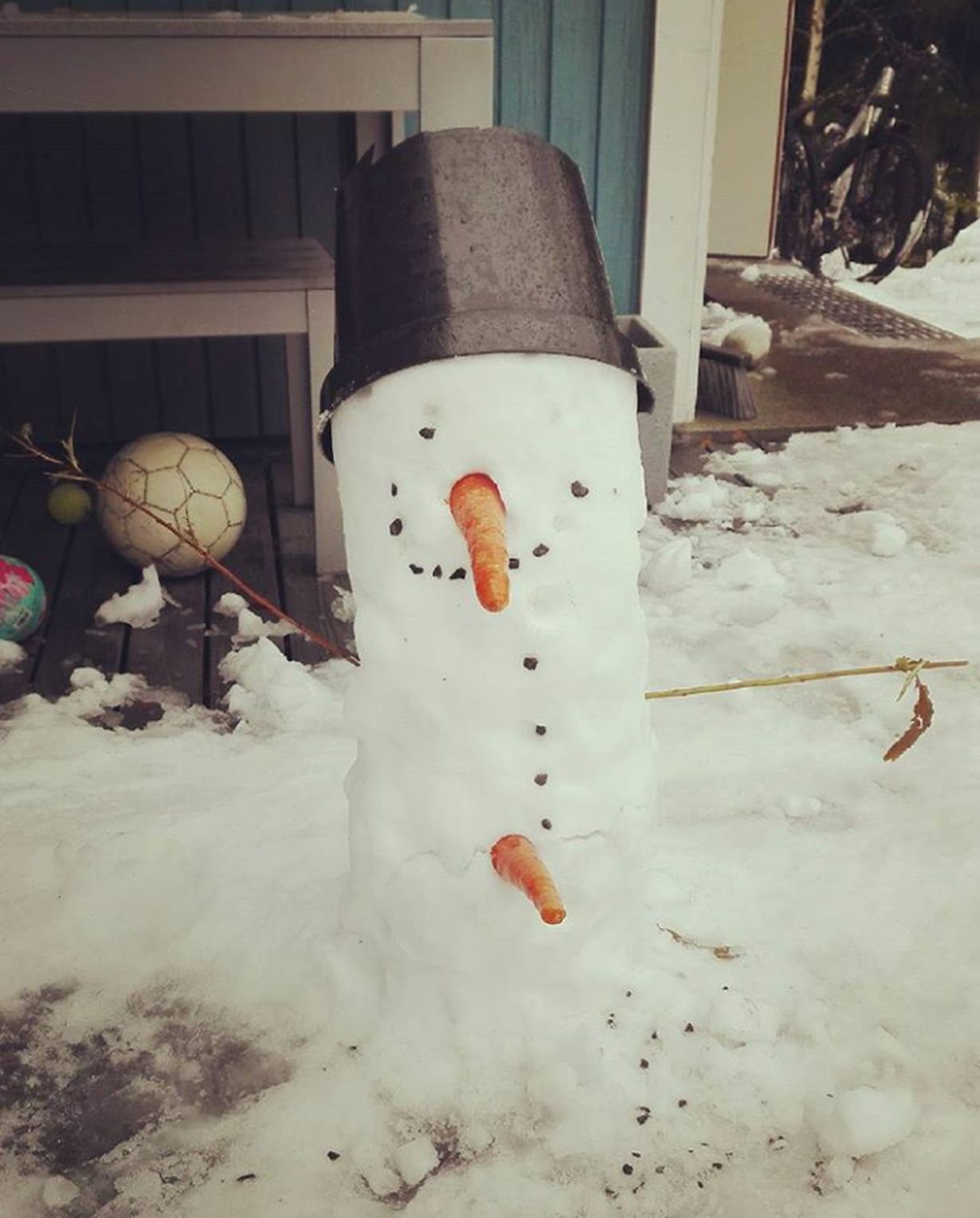 6v tyttäremme teki tämän ensilumen aikaan marraskuussa. Joku vitsikkäistä isoveljistään kävi lisäämässä toisen porkkanan. Ihmettelin kun aamulla ovella käyneet naapurit olivat niin iloisia kunnes huomasin ukon makuuhuoneen ikkunasta.