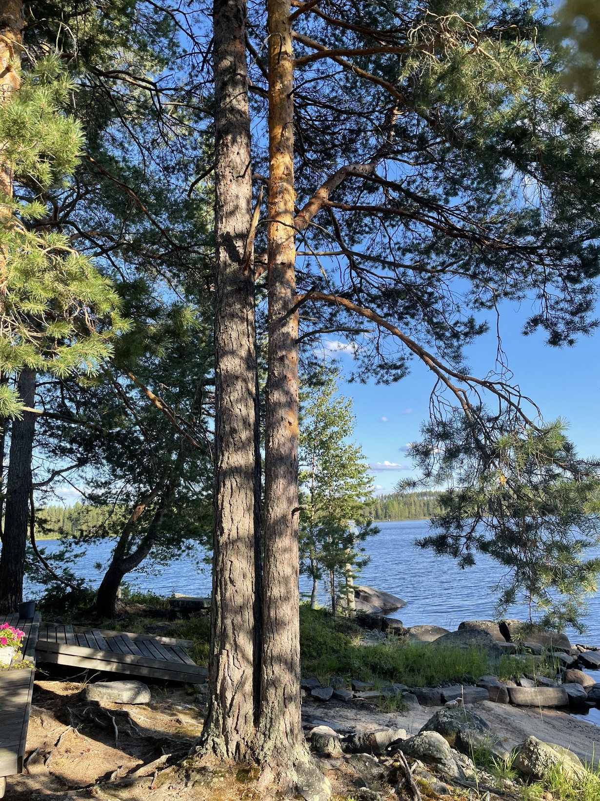 Juha Tapion laulunsanoja lainaten: ”kaksi vanhaa puuta”… nämä kaksi mäntyä ovat meille rakkaat mökkimme rantasaunan kuistin kuppeessa.