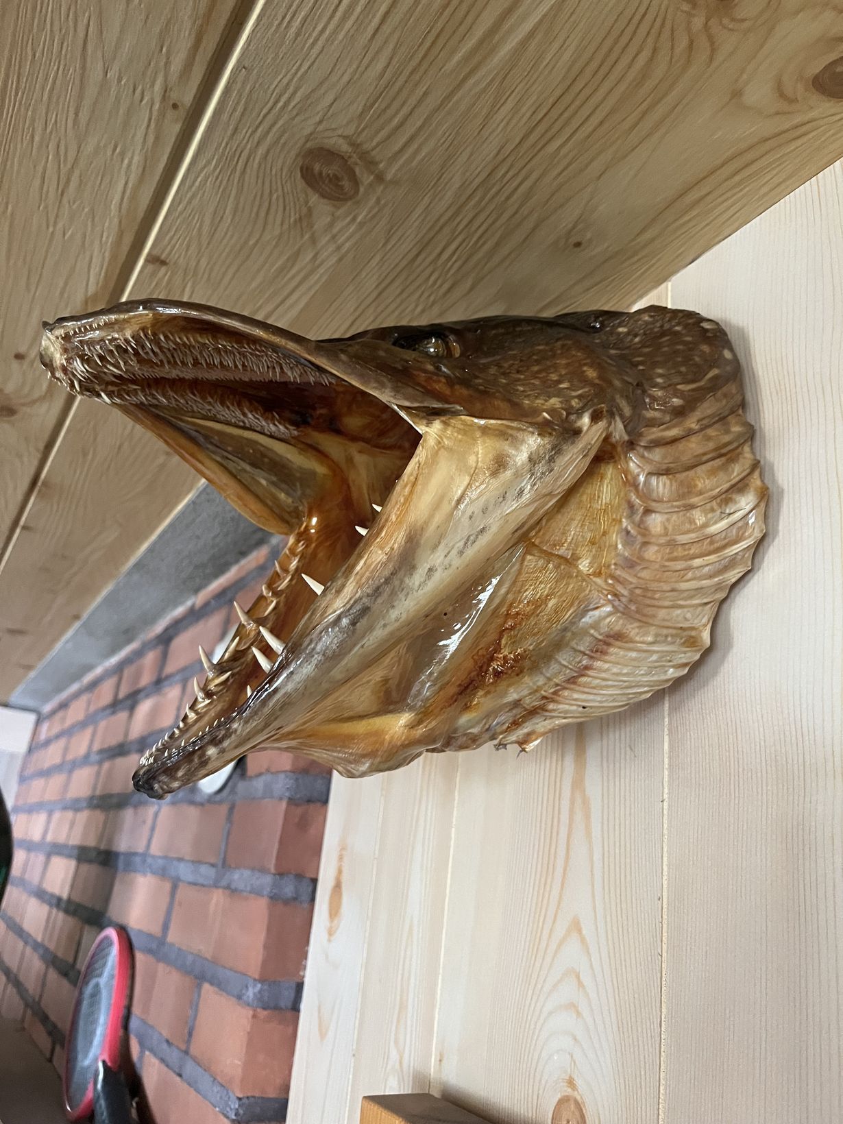 Mieheni sai muutama vuosi sitten komean hauen. Ystävä teki 2,5 kiloisesta päästä muiston. Joillakin on mökin seinässä hirven pää, meilläpä onkin hauen pää!