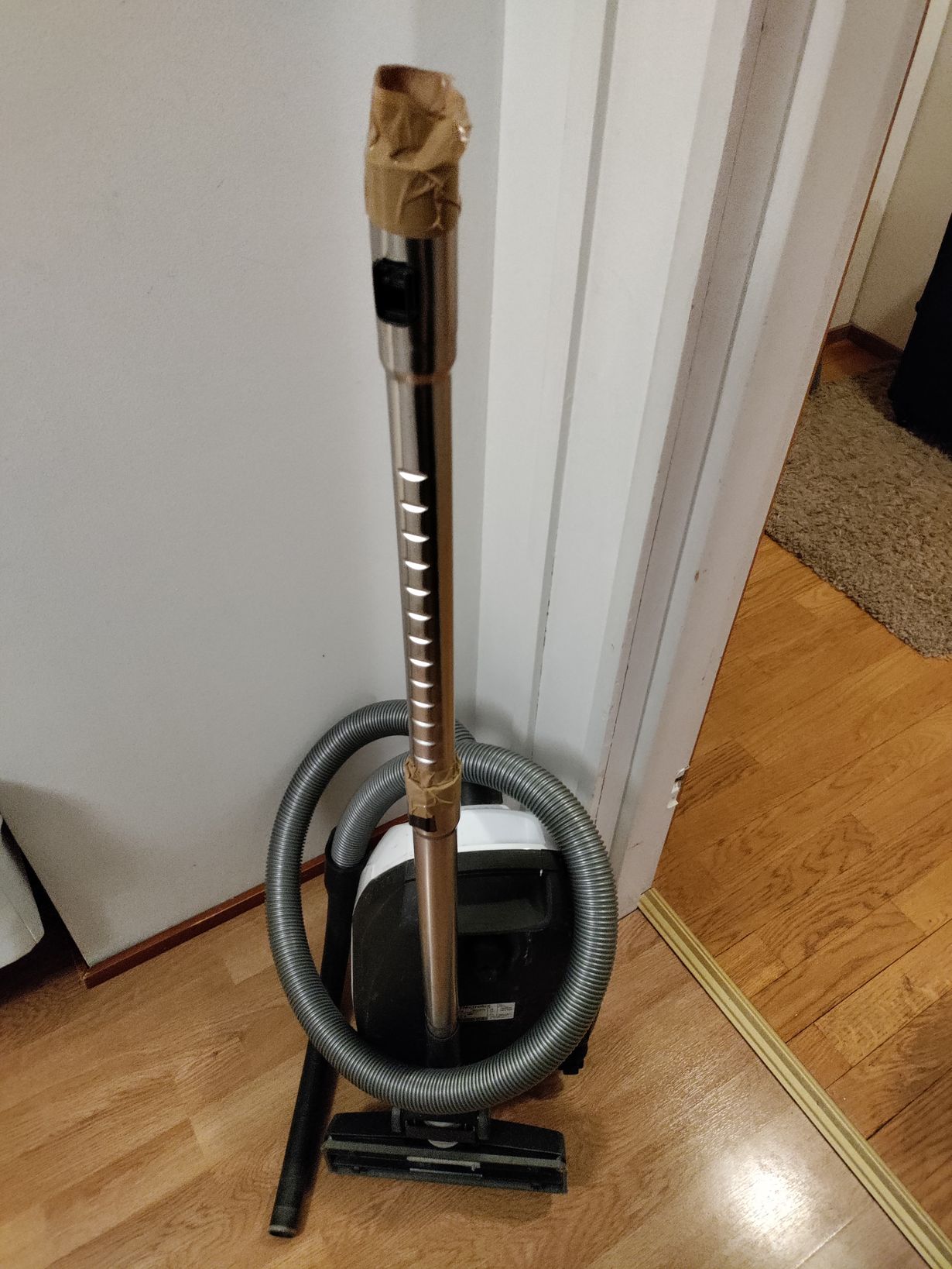 Pölynimurin piti olla lemmikkikotiin sopiva, hiljainen ja tehokas. Alusta lähtien siivous tällä on ollut yhtä taistelua. Osat tippuvat, ja niitä on kiinnitetty teipillä.