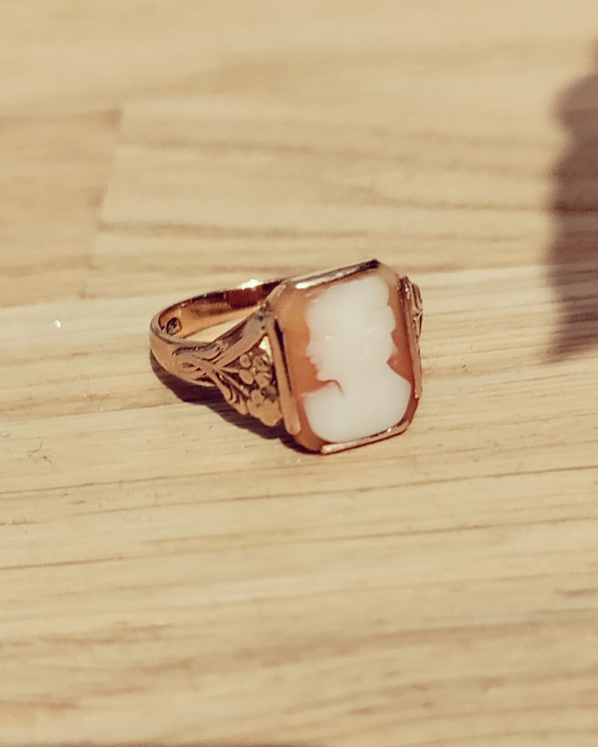Tämä kameesormus on ainoa haluamani perintömuisto edesmenneestä mummostani. Muistan kuinka aina lapsena, ja isompanakin, ihailin sormusta mummoni sormessa. Nyt käytän sitä usein vihkisormuksen sijaan omassa nimettömässäni. Näin mummo ja hänen viisautensa kulkee aina mukanani.