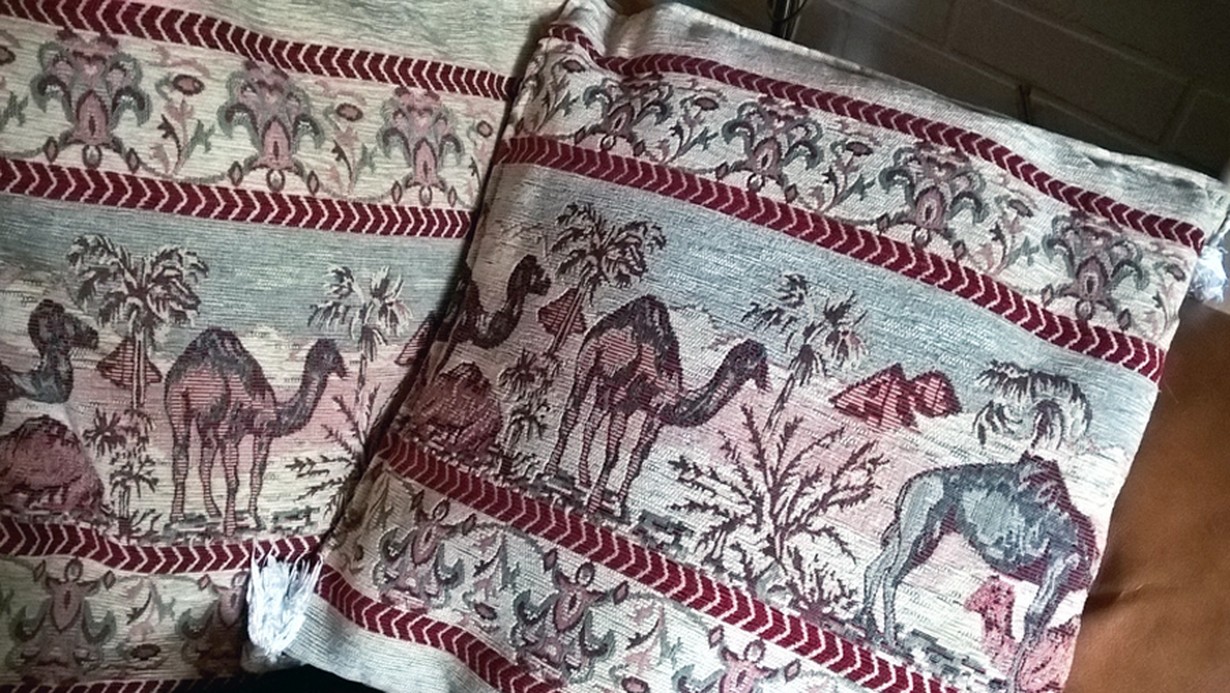 Nämä kamelityynyt on hankittu Turkista noin 10 vuotta sitten jolloin olin siellä tyttärien kanssa lomailemassa. Tyynyt ovat paksuhkoa gobeliinikangasta ja niissä on valkoiset tupsut kulmissa. Osa tupsuista on vuosien varrella hävinnyt elämän virtaan - mutta vielä pidämme niitä sohvalla. Ne kestävät vesipesun koneessa ja ovat meille kovin mieluisat vieläkin - muistuttavat mukavasta Antalian kiertomatkasta.