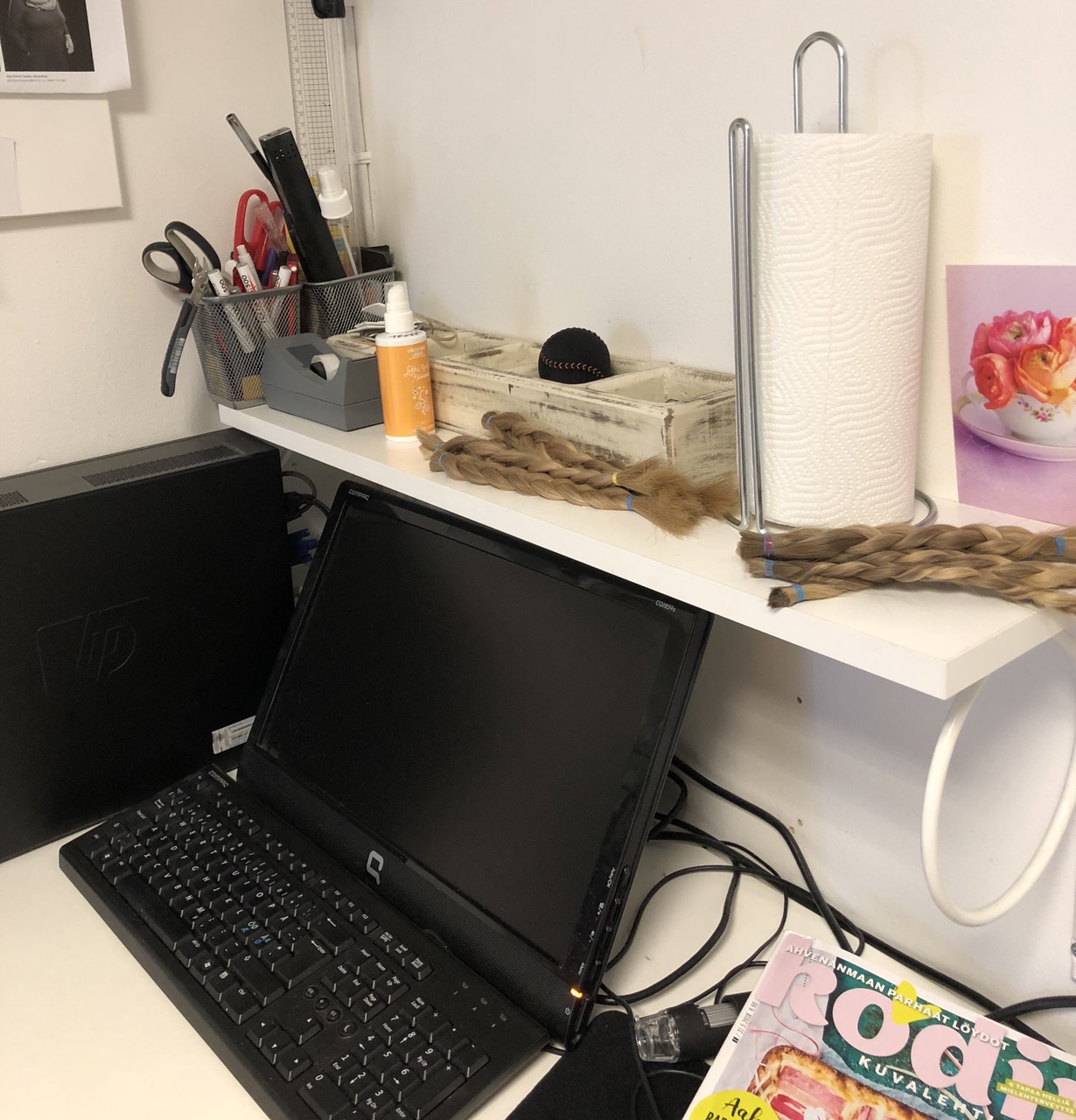Kampaamon takahuoneen hylly
