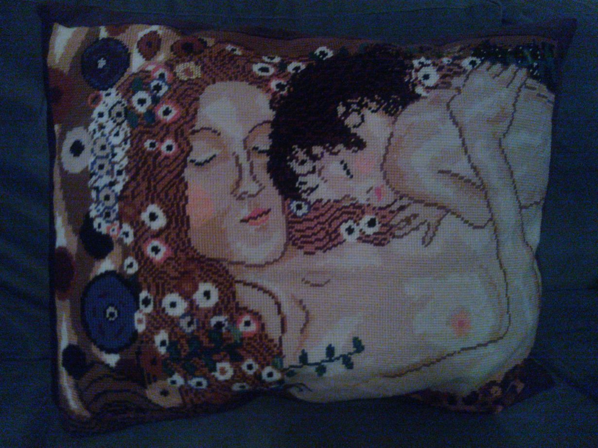 Tämän tyynyn tarina on vasta alussa. Se valmistui loppuvuodesta 2012. Sen pariksi tulee aikanaan Klimtin Suudelma. Aluksi etsin tyynyn aiheeksi kukkaaiheista kanavatyötä, koska mummolassa oli kukkatyynyjä. Päädyin kuitenkin Klimtin kuviin, koska ne ovat sykähdyttäviä.