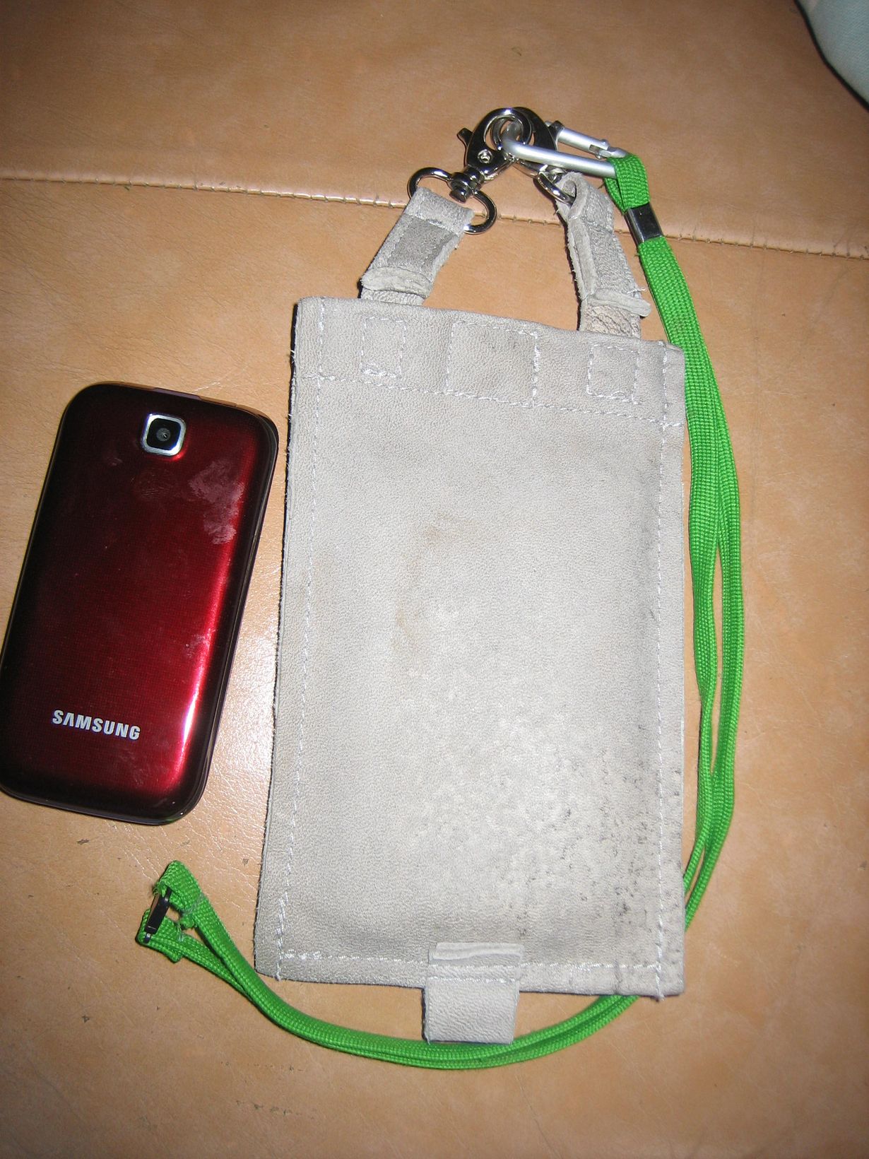 Tyttäremme teki meille molemmille kännykkäkotelot. Tähän sopisi älykkäämpikin laite, meillä on mummi ja ukkimalliset. Materiaali on käytettyä nahkaa. Ukilla mustaa, mummilla harmaata. Vihreä kaulan ympäri menevä nauha on edellisestä Kittekat:ilta saadusta pussista.