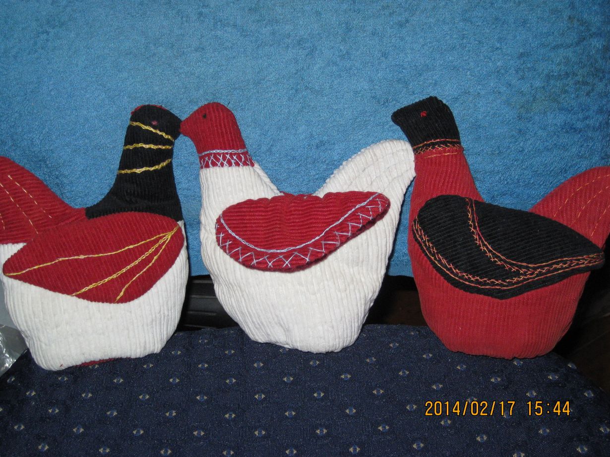 Vakosametinpaloista ommeltuja kanoja, muistaakseni ohje jostain Tilda-kirjasta. Ohjetta muutettu niin, että toisen siiven alla on tasku yllätykselle.