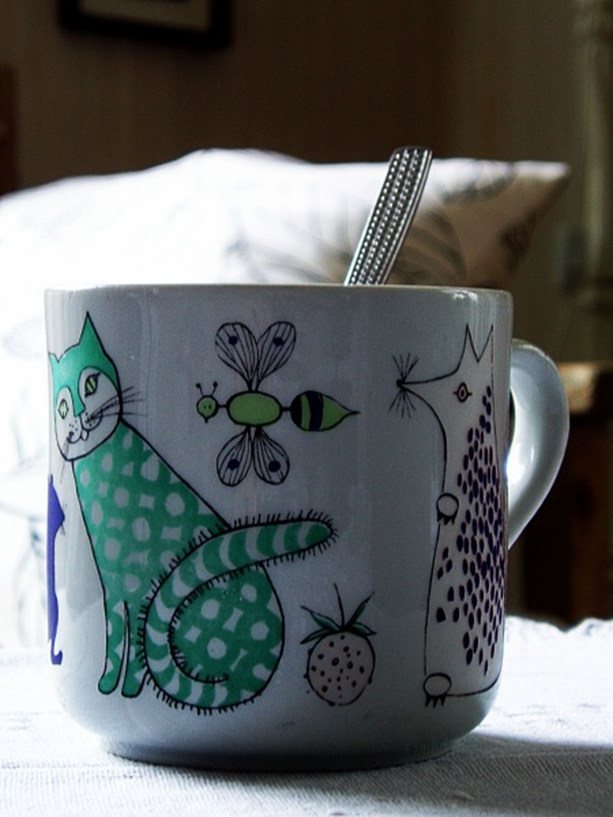 Kirpparilöytö teki onnelliseksi. Kupin värit ovat kuluneet käytössä, niin rakas se on. Oma pieni Arabia-aarre. Oma pieni lempikuppini. Kissu, possu, orava, hiiri ja amppari on aamukahvini kaveri.