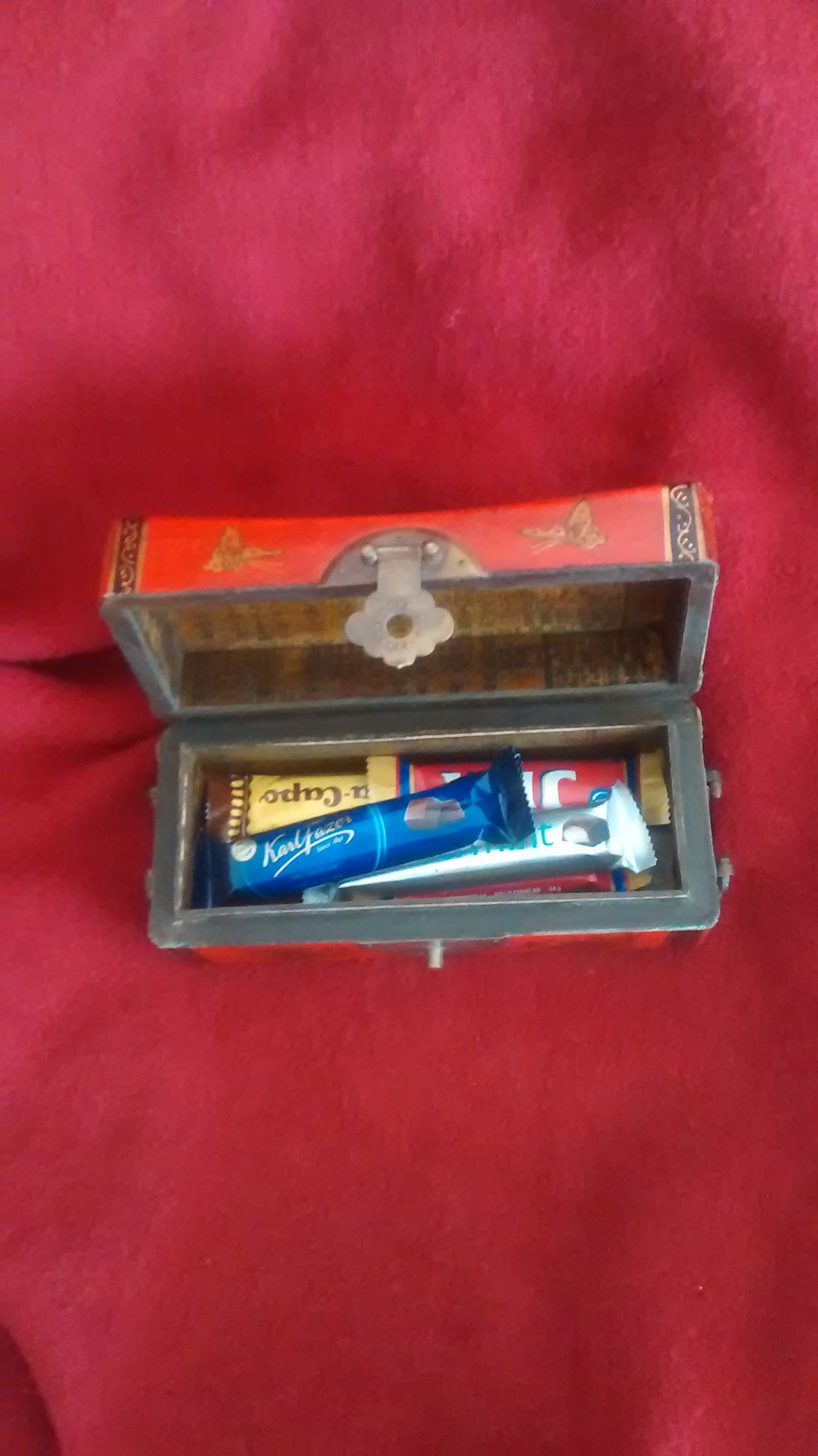 Kiinasta tuotu matkamuisto punainen koristeellinen rasia kätkee sisäänsä makoisia herkkuja. Kun kansi on kiinni pysyvät karkit piilossa ja voi herkutella salassa.