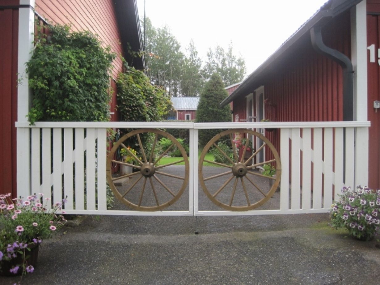 Kärrynpyörät on tehnyt mieheni isoisä joka oli Amerikassa puusepän opissa.Löysimme ne vanhasta aitasta ja nyt koristavat meidän porttia.Sain vihdoin haluamani portin ja vielä kärrynpyörillä :).Tässä portissa on paljon tunnearvoa ja on minun mielestäni maailman hienoin portti:)