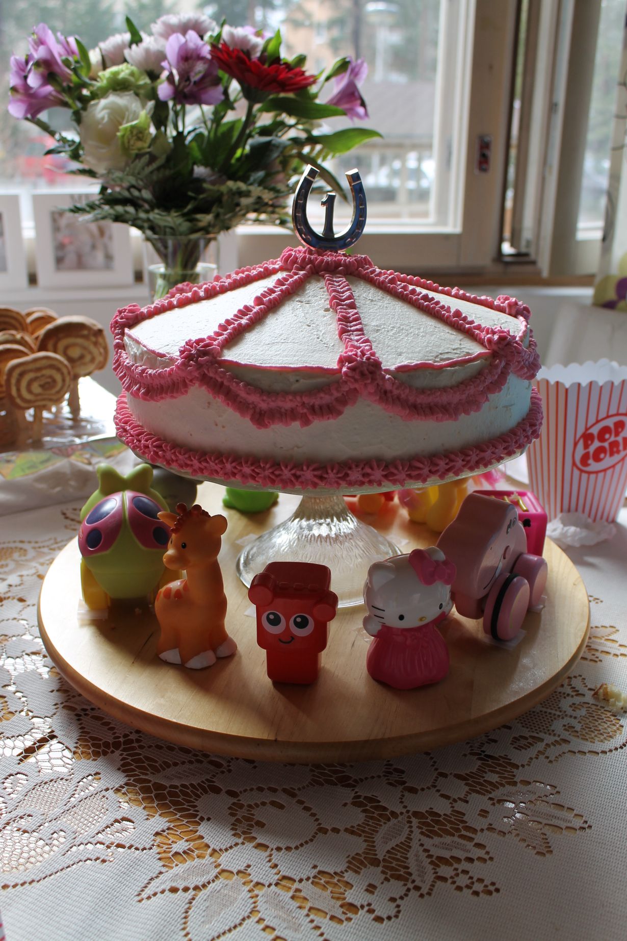 Tein tämän tyttäreni 1-vuotis syntymäpäiville. Teemana oli sirkus ja tarjoilut piti olla sitten siihen sopivia. Kakuksi valikoitui karuselli, jonka piti vielä pyöriä. Jääkaapissa alusta kostui niin, ettei alustaa pyörittänyttä autoa enää saanut kiinni teipillä.