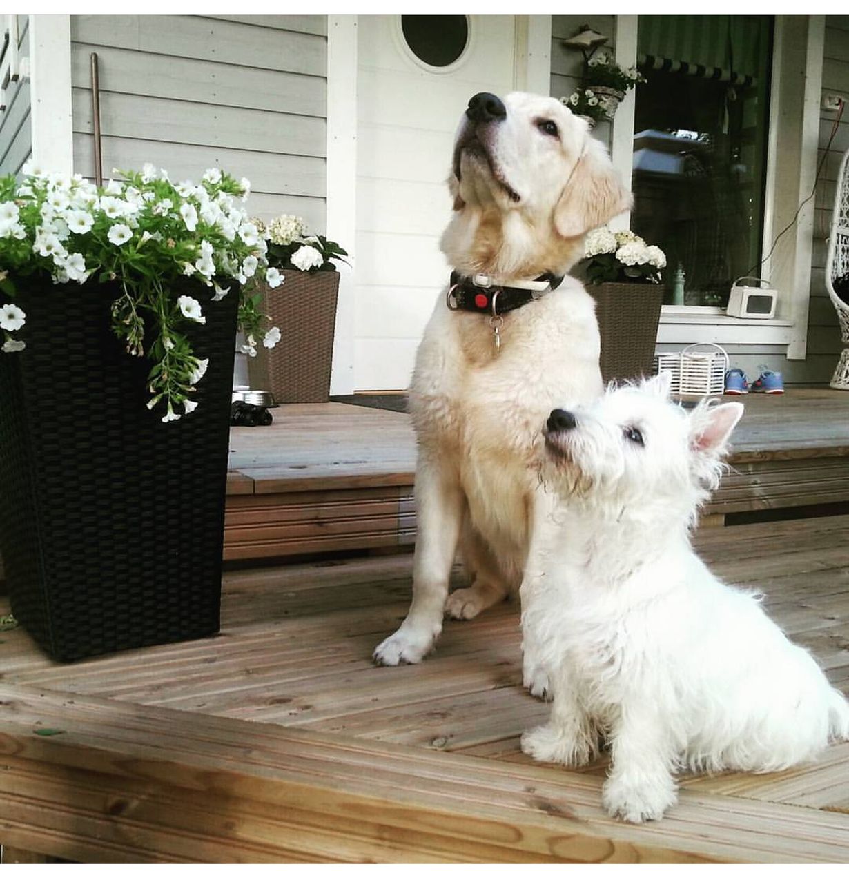 Yoda ja Nemo ovat tyttärien perheiden karvatassuja, jotka touhuavat välillä kimpassa ihan vauhdikkaastikkin. Tässä kuvassa opetellaan vähän tottelevaisuutta,