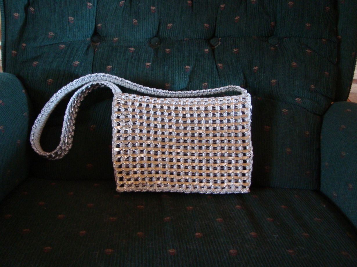 Juomatölkin nipsuista tilaustyönä teetetty juhlalaukku.