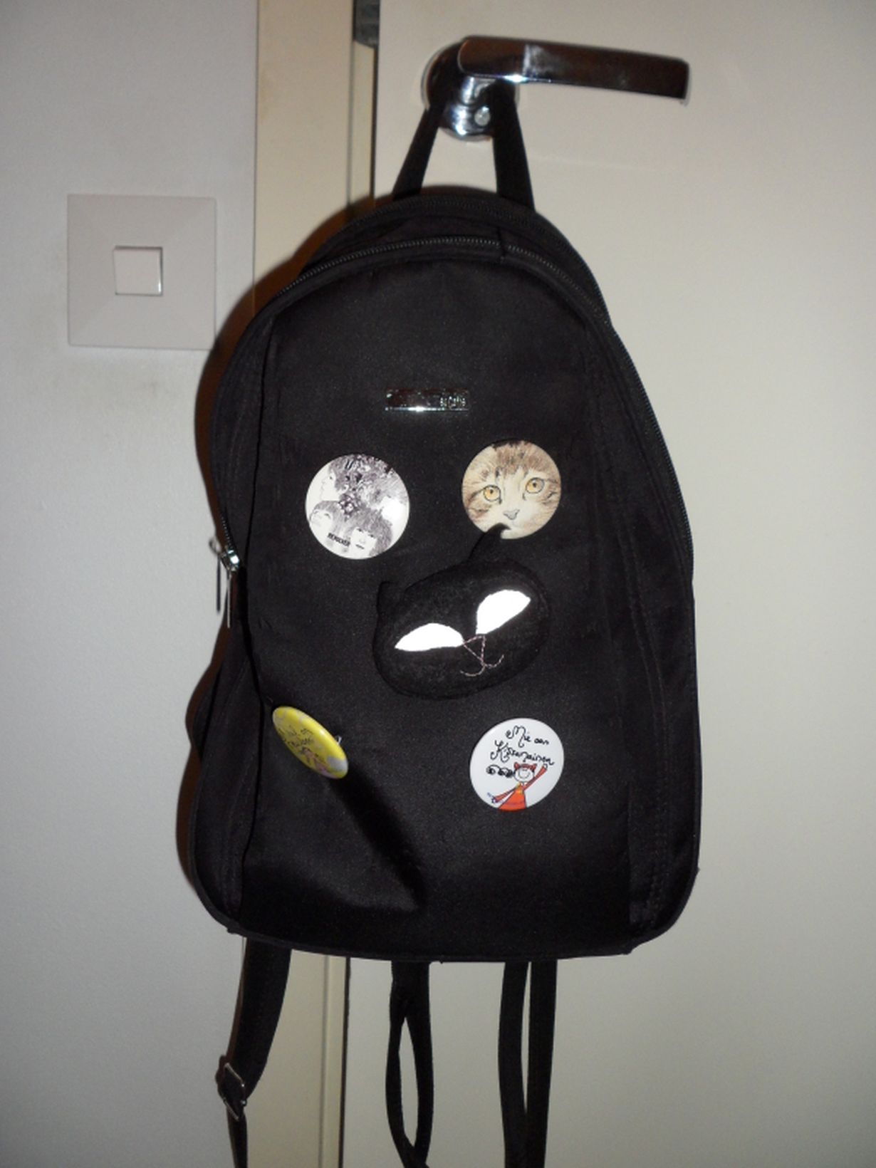 Minulla on musta pikkureppu täynnä merkkejä: Virkkukoukkusen Miul on neuloosi/Mie oon kissanainen, The Beatles ja kankainen kissunnaama sekä käsityömessuilta ostettu kissansilmäheijastin. Tyypillinen vähän yli viiskyt vee tädin käsilaukku?!?