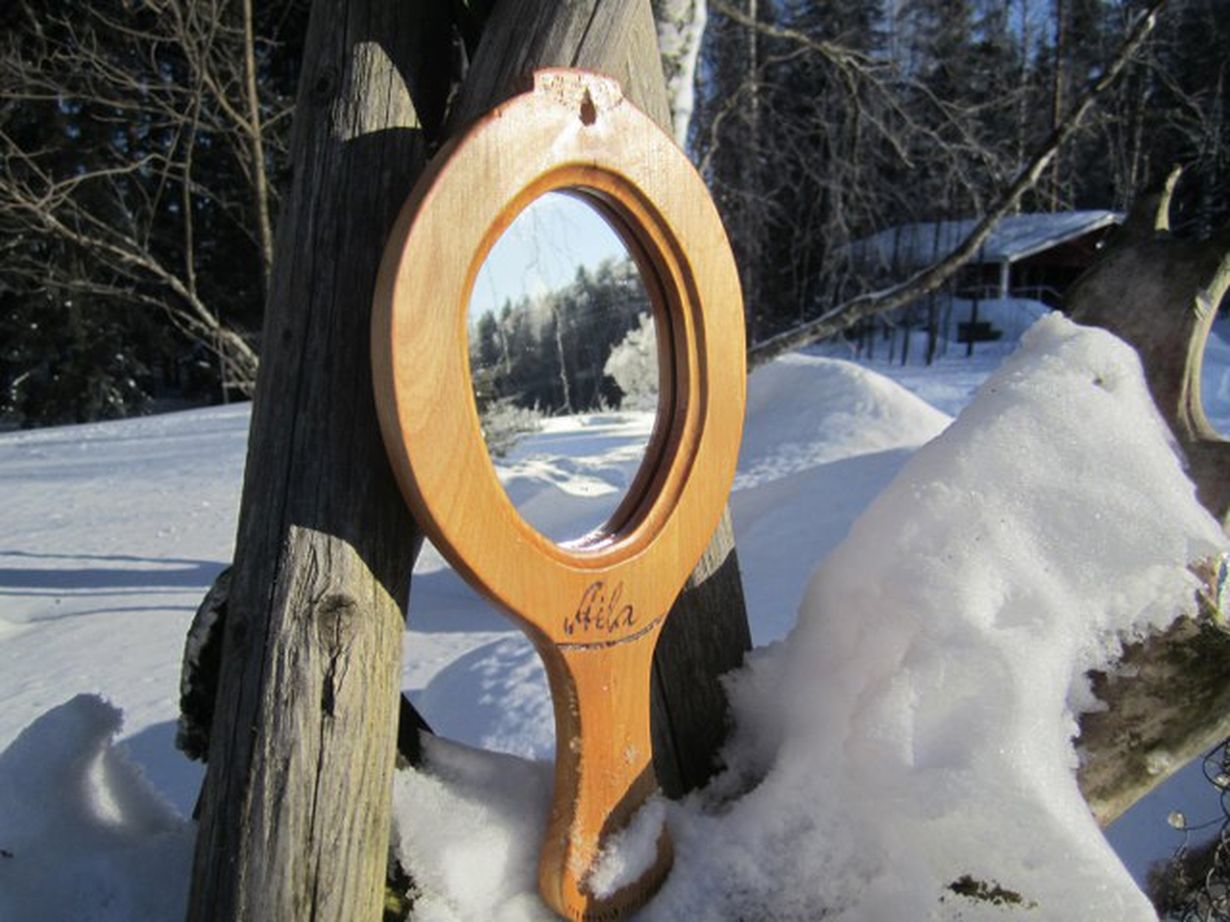 Tämä peili on veljeni tekemä. Kehykset, tausta ja varsi ovat tukevaa puuta, koristeet kolvilla poltettu. Etupuolella nimi ja takapuolella v. 1993.