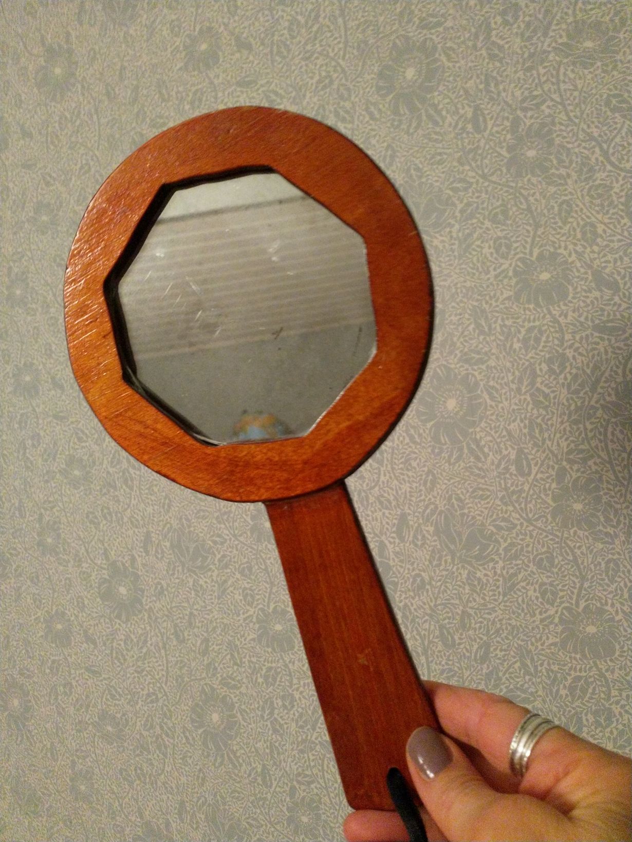 Peilin tein puutöissä kansakoulun kuudennella. Se on kulkenut matkassa 48 vuotta. Peili on hieman sumentunut mutta onpahan armollisempi katsojalle.