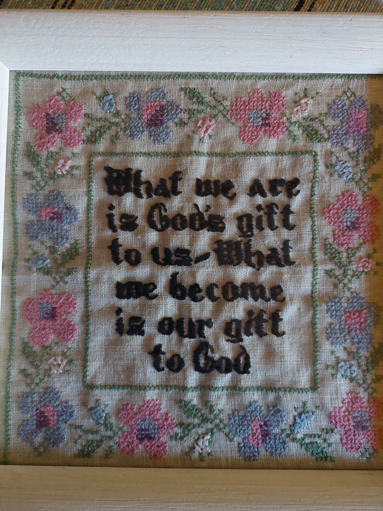 Olin ostanut matkamuistoksi huoneentaulun,jossa hyvä teksti.Se odotti vuosia ennen kuin sain tehdyksi.Itselleni lahjaksi jäi,kun siitä ei tullut mielestäni kovin siisti.