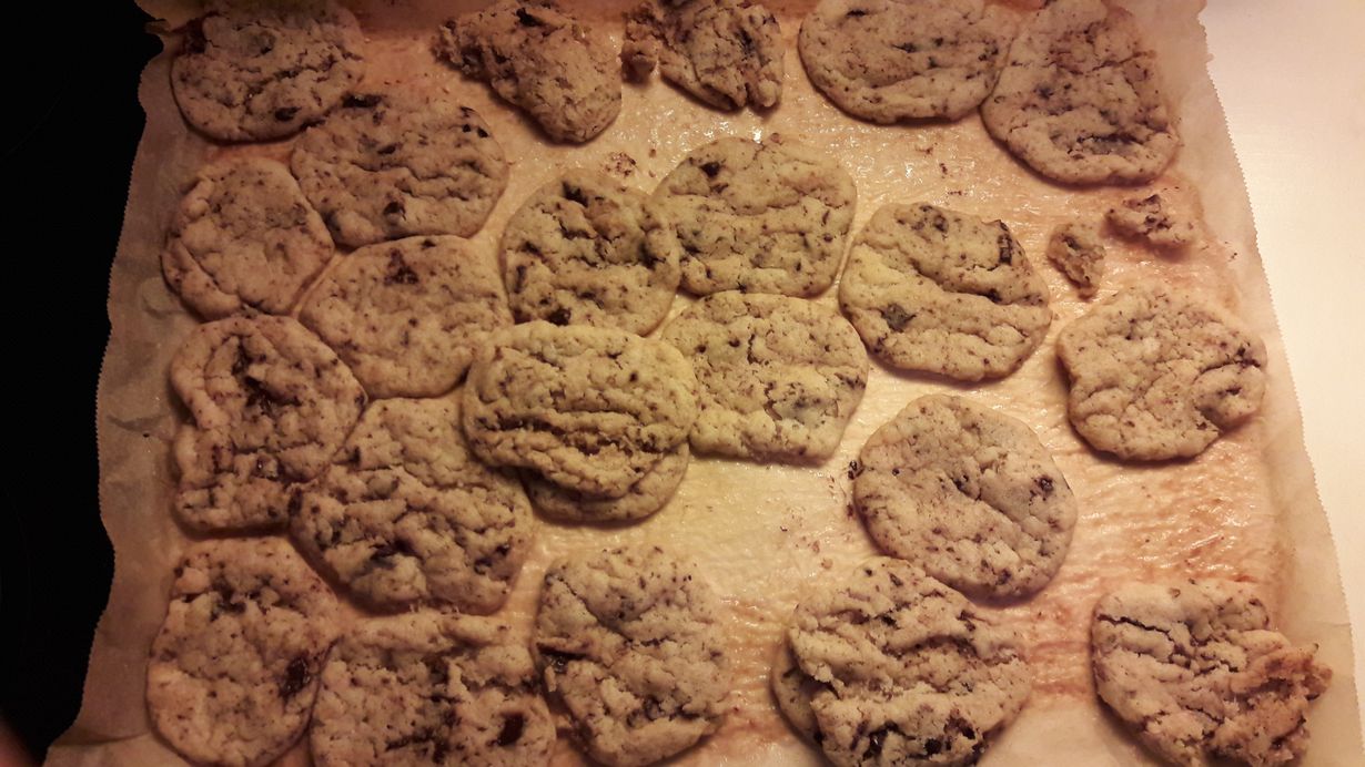 Kun suklaa-cookiet tulivat ulos uunista, vetaisin leivinpaperin pois pelliltä ja pikkuleivät lensivät toistensa päälle ja menivät kaksinkerroin ja hajosivat. Tämä käsityö nyt ei oikein onnistunut.