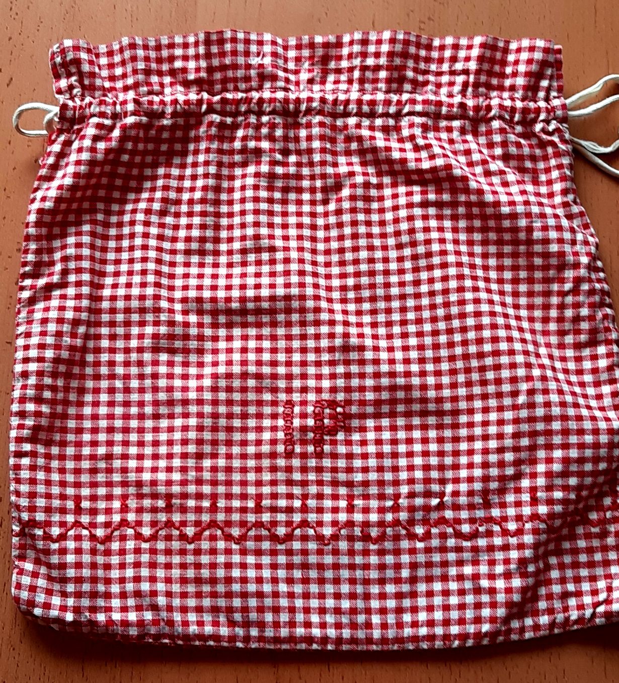 Kansakoulussa n. 60 vuotta sitten tehty käsityöpussi. Lähemmin tarkasteltuna näkee, ettei ihan tuskatta ole valmistunut...purkaa on pitänyt välillä!