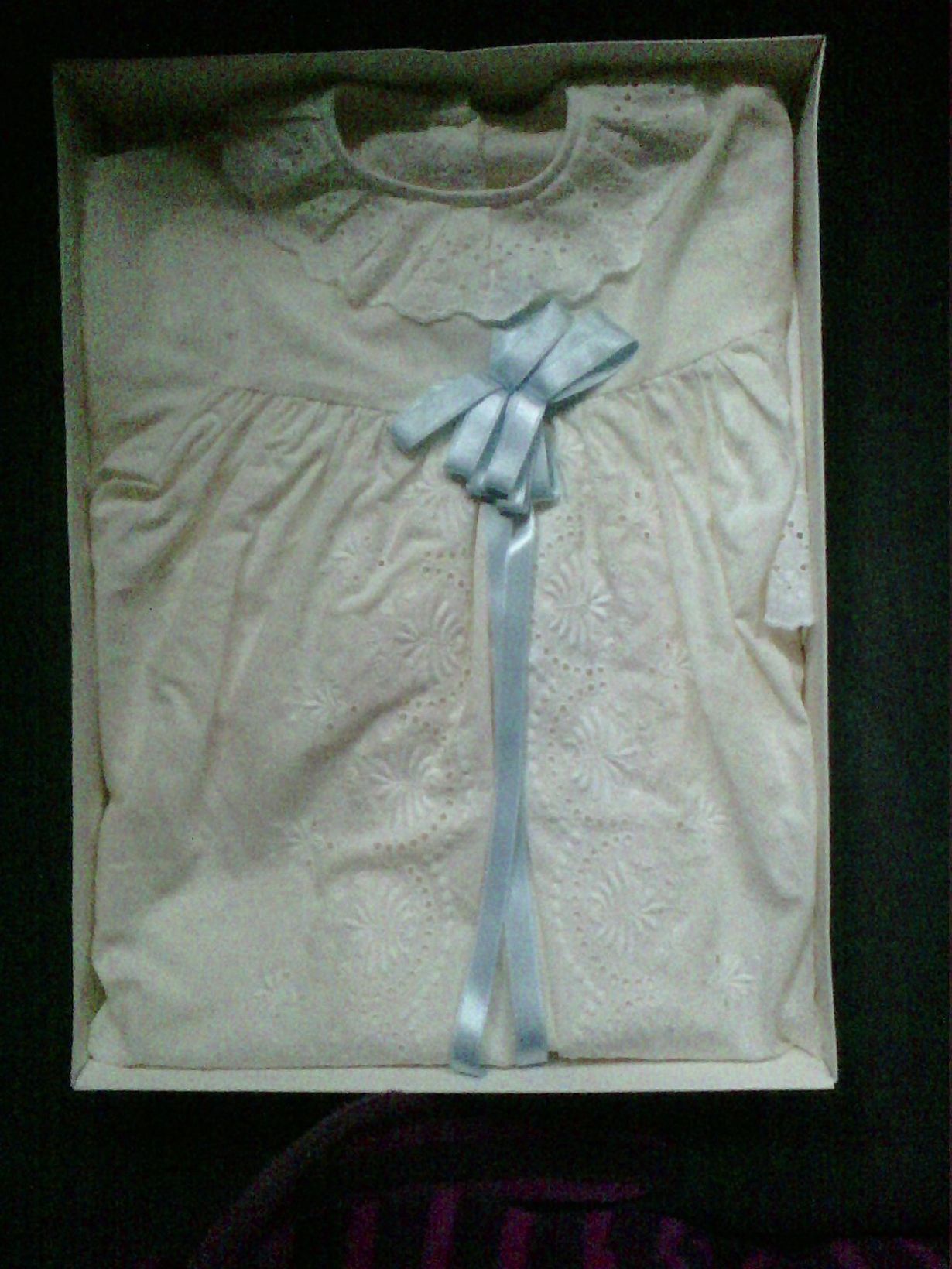 Kuvassa on kastemekkoni. Mekon laatikossa lukee KARIN ISOSAARI LAHTI, joka on ilmeisesti valmistaja. Laatikkoon on myös mustekynällä kirjoitettu 1967 elokuu (olen syntynyt kesäkuussa), sekä hinta 29,-.