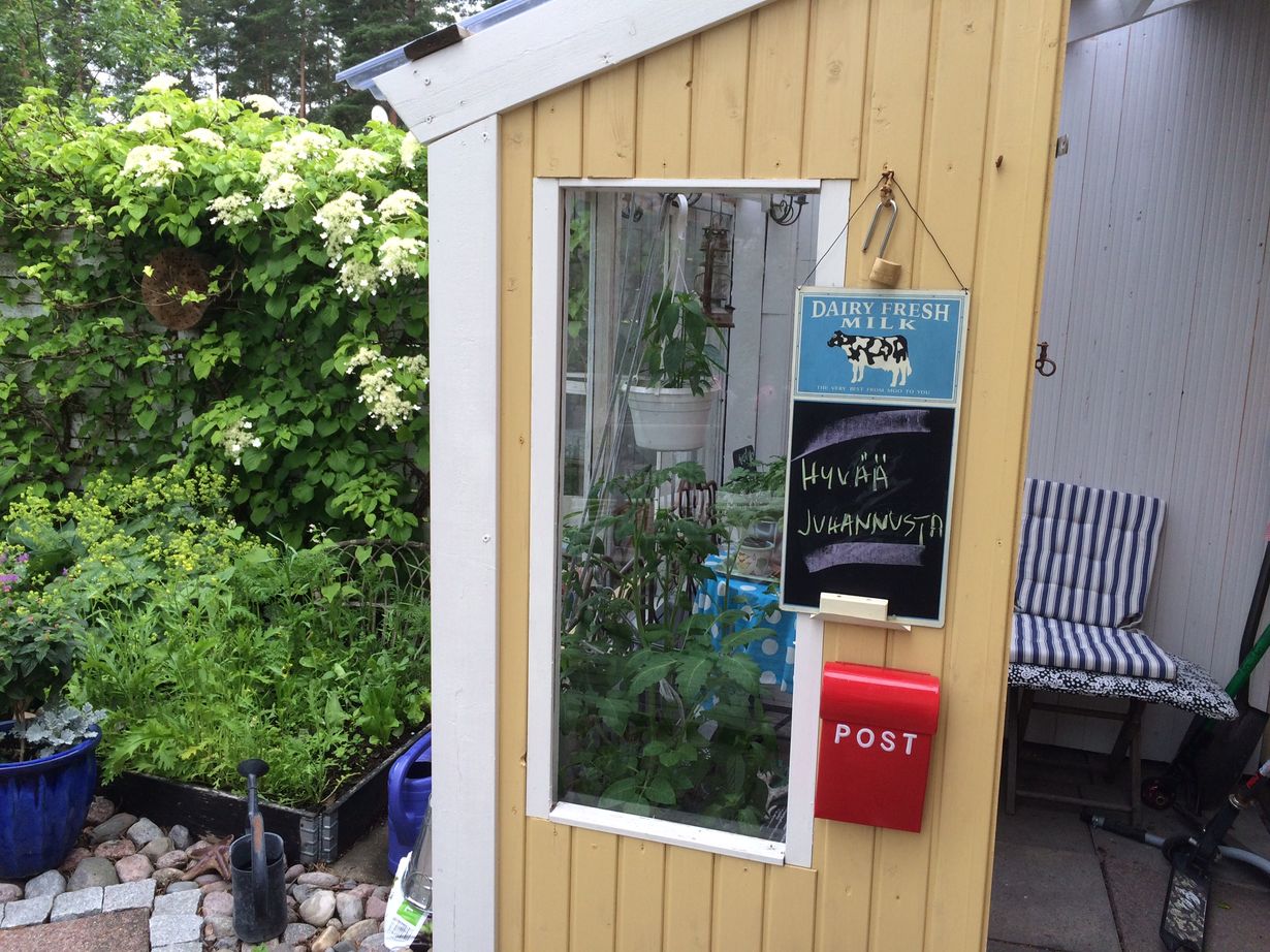 Rakensimme varaston seinän vireen pyörävaraston kierrätysmateriaaleista mm. Vanhoista ikkunoista. Pian huomasin, että sehän mahtava kasvihuone ja tytär omi osa siitä leikkimökiksi. Siellä on kasvatettu monet kesät tomaatteja, chiliä ja vesimelonia.