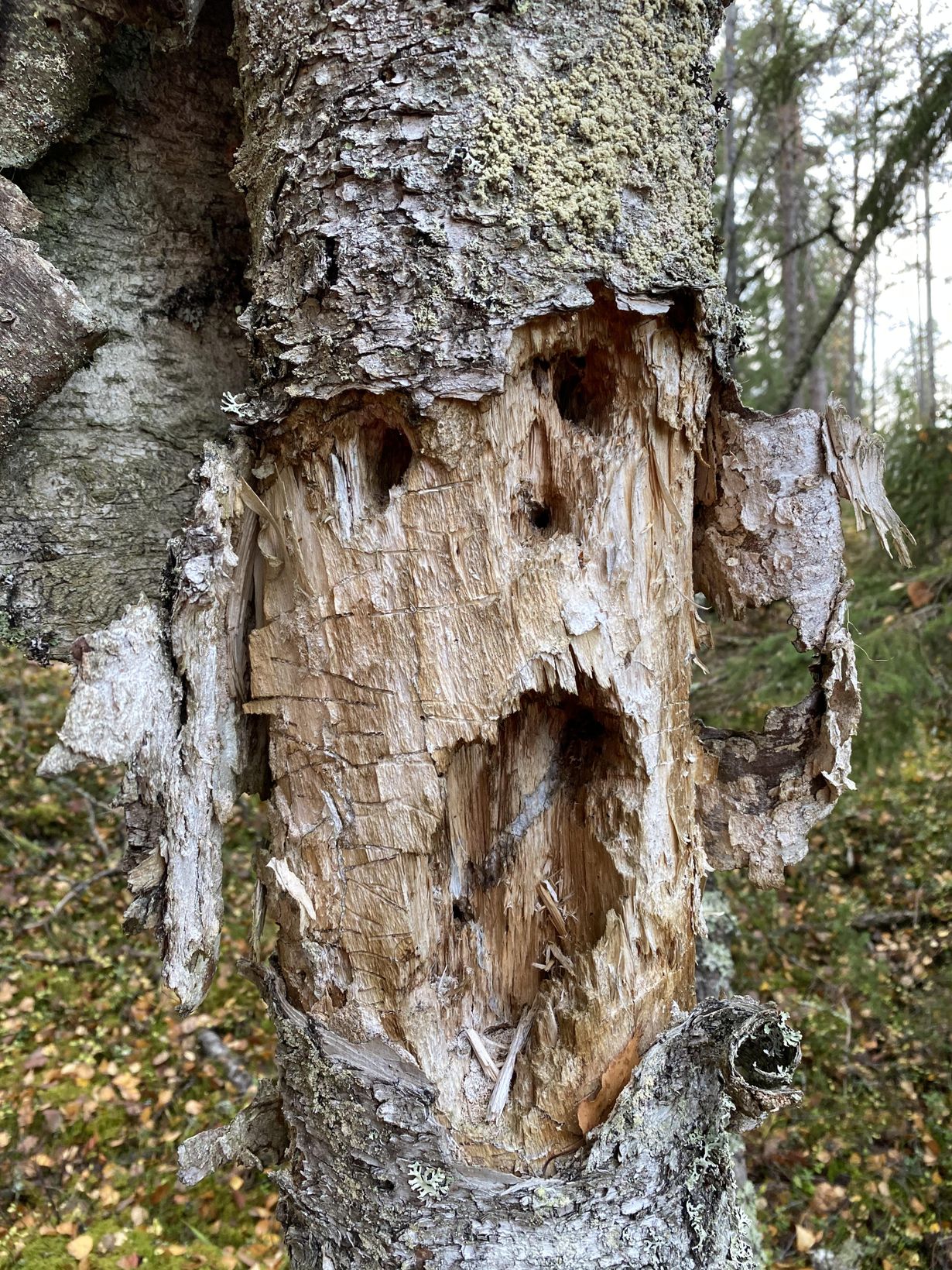 Kuva on otettu Hyyppäänvuoren laella Keski-Suomessa. Hyyppäänvuorta sanotaan Keski-Suomen Koliksi päältä aukeavan upean järvimaiseman vuoksi. Kasvot puussa tuli vastaan polun varrella, kun olimme siskon kanssa sienimetsällä. Osa kasvoista on varmasti ihmisenkin aiheuttamaa, ei pelkästään tikan tekosia. Hauska löytö tuo joka tapauksessa oli! Puun kyljessä otettiin siskon kanssa muutama hassuttelukuva puun ilmettä matkien, mutta niitä otoksia en kehdannut tähän skabaan liittää. :)